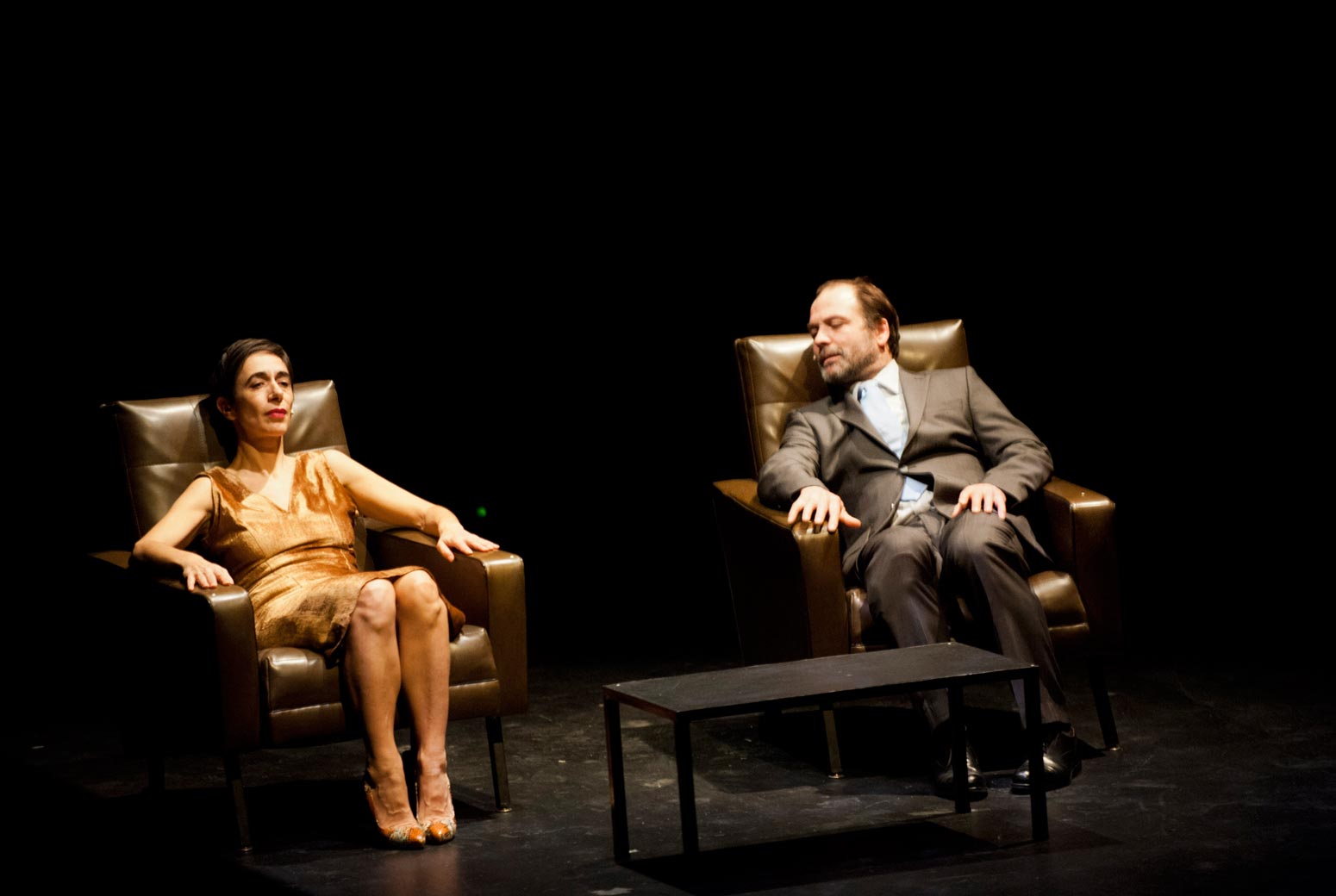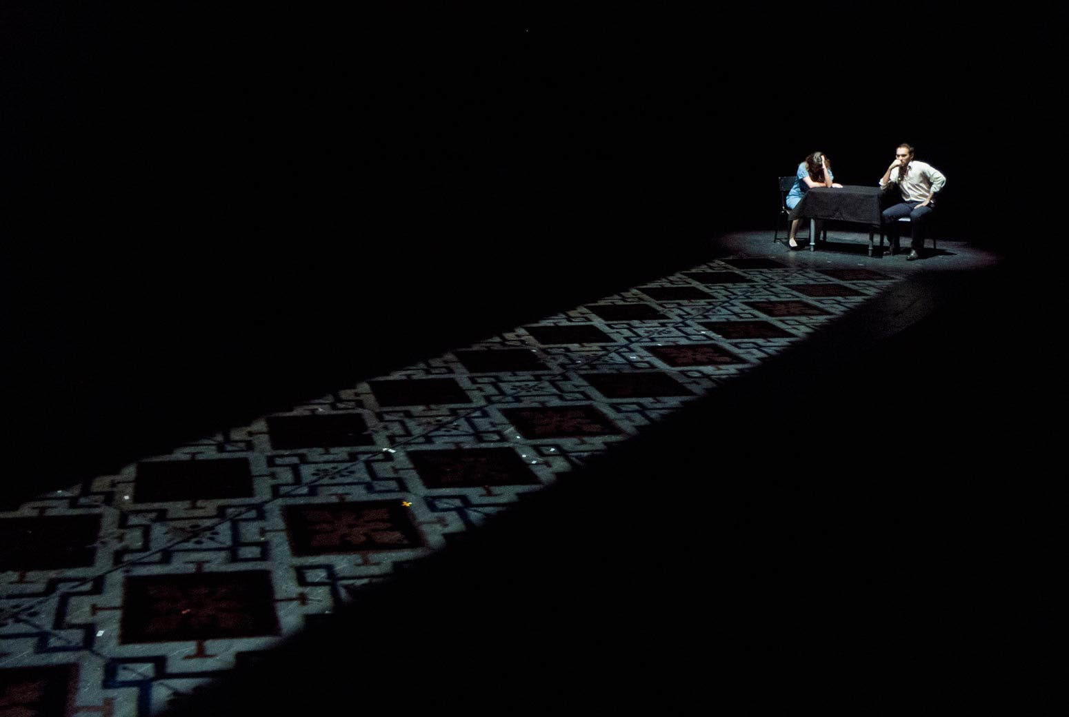 Scéniquement, c’est certes un peu linéaire, enchaînement de scènes avec passage au noir et musique, mais c’est aussi toujours surprenant. Grâce notamment à un gros travail de lumière qui joue avec une pénombre constante, et qui donne un certain mystère, un certain danger, même, à chaque scène. Cela tient aussi au choix du couloir de jeu, aux côtés duquel sont placés les spectateurs, en un dispositif bi-frontal. Forçant ces derniers à « rater » certaines actions et à choisir là où ils placent leurs regards, à être actifs en permanence. C’est aussi l’occasion de jouer avec la distance de jeu, véritable outil au théâtre. Se parle-t-on de la même façon lorsqu’on se crie son amour de très près ou quand on se le chuchote de très loin ? De plus, sur scène, la distance entre comédiens crée aussi l’espace et le vide, qui permettent au spectateur de le remplir et d’y mettre de lui.