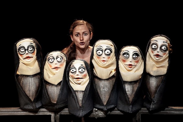 La belle vitalité de Marta se drape alors d’une longue robe noire, et Angela promptement mariée au Christ contre son gré, devient sœur Docile. Vivant à présent à huit clos entre les murs du monastère, le petit groupe de femmes, – représenté par des marionnettes – s’organise autour des règles qui leur sont imposées : pas de livre, pas de musique, pas de théâtre.