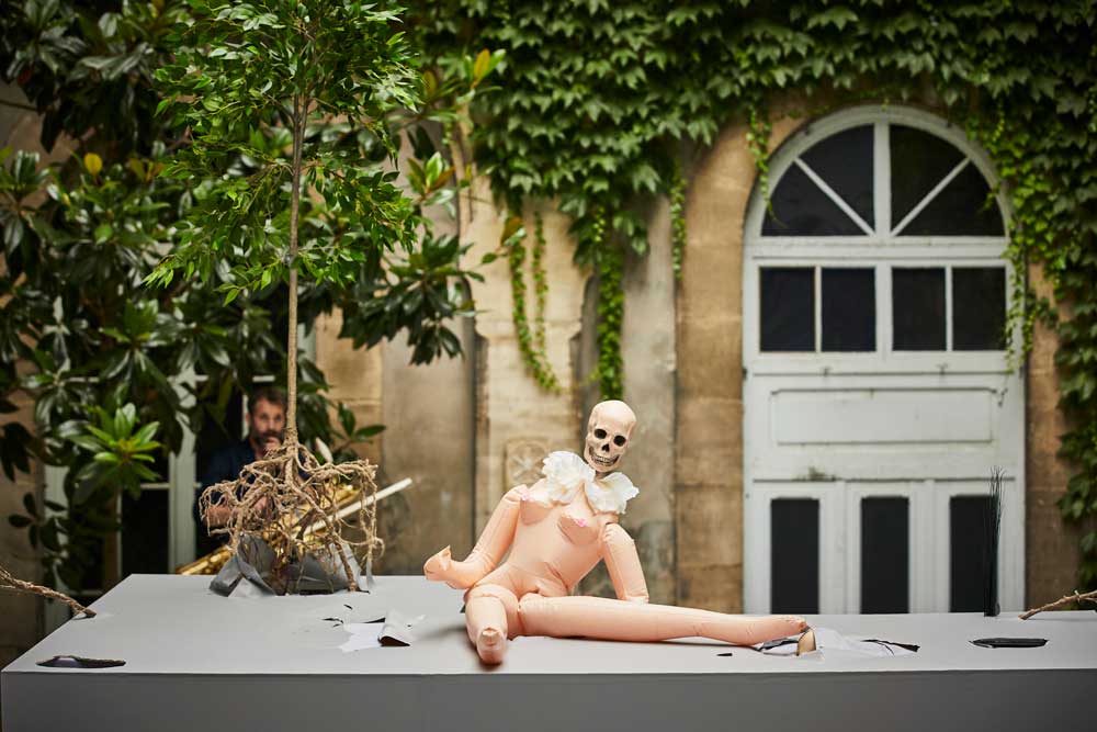 Destruction d’un paysage. Làoùtesyeuxseposent est une performance hallucinée, théâtre d’objets sans acteurs, du moins visibles, poème visuel, installation d’art contemporain entre baroque et surréalisme. Successions de tableaux, entre nature morte et vanité, paysage étrangement changeant et fragile annonçant notre catastrophe écologique irrémédiable. Sur ce plateau, étroit rectangle blanc, le chaos progressivement s’installe. Surgissent du sol qu’ils crèvent littéralement racines d’arbres, oiseaux empaillés, rats mécaniques… vite engloutis par vagues successives d’étranges et cauchemardesques formes noires, on songe aux plaques de mazout. Une vierge miraculeuse pleure du sang après avoir explosée et perdue son enfant, tombé à ses pieds. Crânes, miroirs, fruits en décomposition, fleurs pourrissantes composent le corpus classique de natures mortes mais détournés ici de façon ludique et tragique. Le terme anglais serait ici plus judicieux, précis, « still life », car quelque chose ici est bien en attente, la catastrophe à venir, et cette nature n’est pas plus morte que ça qui semble ne pas renoncer avant de sombrer à son tour. Cependant que d’étranges tuyaux flexibles autonomes accélèrent ce massacre. Car ici, pas l’ombre d’une présence humaine, seules deux poupées gonflables coiffées d’une tête de mort, enlacées dans une grotesque et dérisoire étreinte, rassemble allégoriquement et terriblement toute notre humanité avant elles aussi de disparaître. Un torse de femme sera bien extirpé des dessous de la scène mais manipulé comme un cadavre, observé entomologiquement comme une espèce sans doute disparue. Et quand tout semble enfin achevé, un carton Amazon se livre de lui-même. Son contenu ? Des marionnettes à gaine, visages de cire gris, qui vont continuer ce jeu de massacre, jusqu’à s’autodétruire. Aucune parole ne sera prononcée durant cette demi-heure sauf, à la fin, répétée en boucle par un disque rayé : « Pourquoi mon corps devrait-il s’arrêter à la frontière de ma peau ? », phrase énigmatique qui sonne ici comme une épitaphe que nul ne peut désormais entendre. Il y a bien quand même une présence humaine, Thomas Quinart, bien vivant, saxophoniste et compositeur, usant aussi de drôles instruments bricolés, lequel crée en direct une bande sonore ad-hoc en contrepoint des images. C’est une demi-heure d’une beauté crépusculaire, apocalyptique qui vous touche fortement au plexus. Une vanité contemporaine, avec trois fois rien où à peine plus, allégorie d’un monde à l’écosystème dévasté. Devant cet imaginaire poétique et cette conscience lucide au monde, ce bricolage souterrain merveilleusement inventif, on se dit que Johanny Bert est le digne héritier d’André Breton, Salvador Dali, Jean Cocteau, et particulièrement James Ensor. Et pour ce qui est du bricolage justement, de la manipulation, Johanny Bert a eu l’heureuse idée d’enregistrer les coulisses de cette performance. Au lendemain de chaque représentation les spectateurs peuvent ainsi découvrir cette création « d’en dessous », comme un autre point de vue. Une façon aussi d’offrir un peu d’humanité à défaut d’espoir. C’est ici : parislete.fr/_les-dessous-du-spectacle