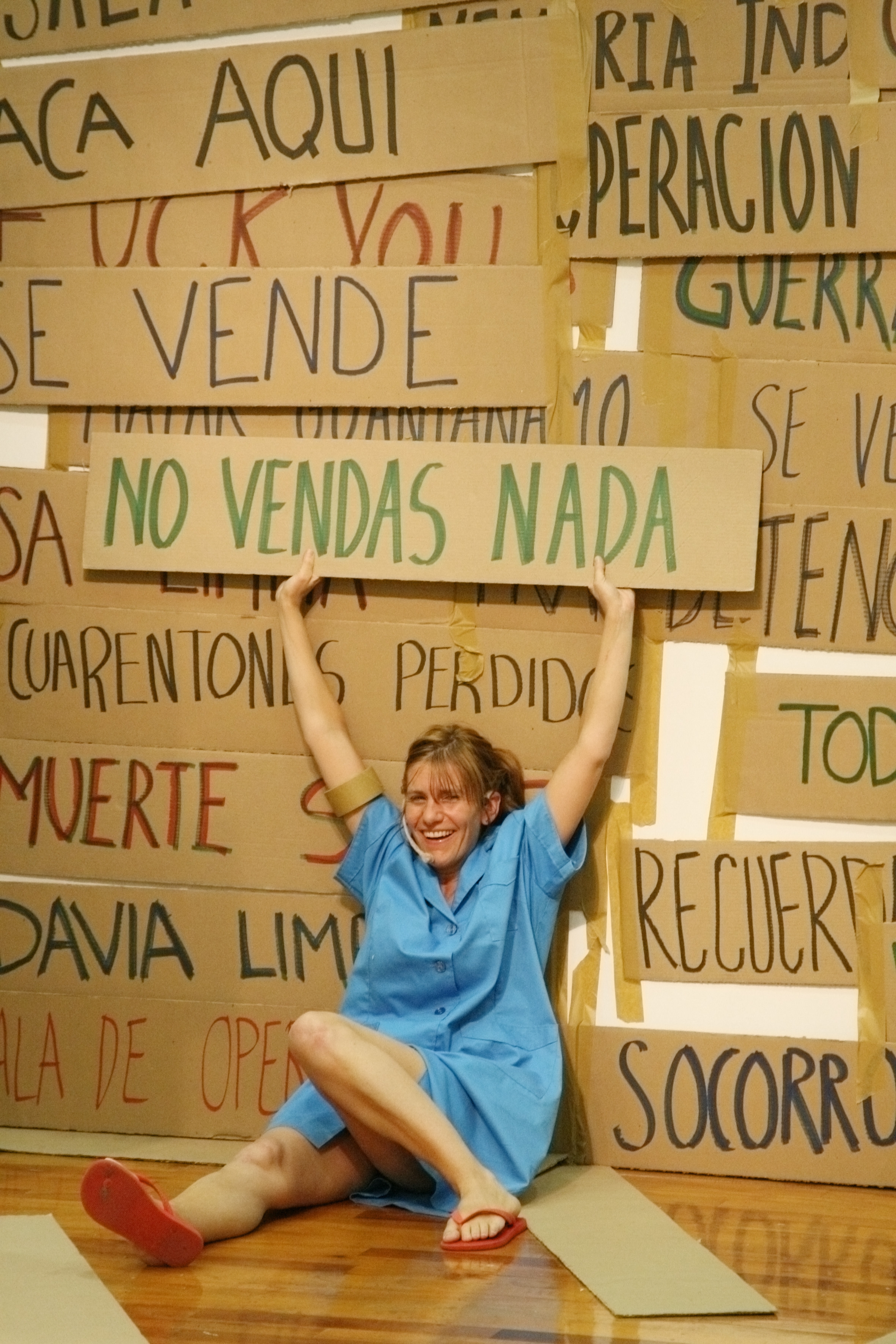 Le Festival d’Automne à Paris présente cette année installations plastiques, spectacles, films, moyens d’expressions multiples, simples et tenaces de La Ribot. Laughing Hole était présenté au Centre national de la danse de Pantin le 5 octobre. Et pour débuter cet article, le plus simple est sans doute de laisser parler La Ribot, lors d’une interview donnée à Florian Gaité en mai 2019, pour le Festival d’Automne. Dans Laughing Hole « On y voit neuf cents panneaux sur lesquels j’écris des mots se rapportant à trois situations : l’état du monde en 2006 (« illegal », « war », « torture »), ma vie cette même année (« mum », « over 40’s »…) et la performance elle-même (« laughing », « falling »…). J’assemble ces termes entre eux et ne conserve que les associations qui ont du sens. » On peut ajouter à ces petites informations que tous ces mots construisent des expressions coup de poing comme « Look at terror », « Raw touch », « Die in Guantanamo », le tout écrit sur des panneaux en carton que pendant cinq heures, en riant non-stop, mais aussi en tournicotant, en se traînant au sol, que Tamara Alegre, Olivia Csiky Trnka, Delphine Rosay vont aller scotcher sur les murs en béton de la salle, accompagnées par le mixage en live lui aussi de Fernando de Miguel. C’est l’horreur de la prison de Guantanamo qui a inspiré Laughing Hole à La Ribot, le spectacle créé en juin 2006 à Bâle. Et c’est son talent, son sens inné des mélanges, sa force donc, qui vont faire le reste. Avec trois femmes, un homme.
