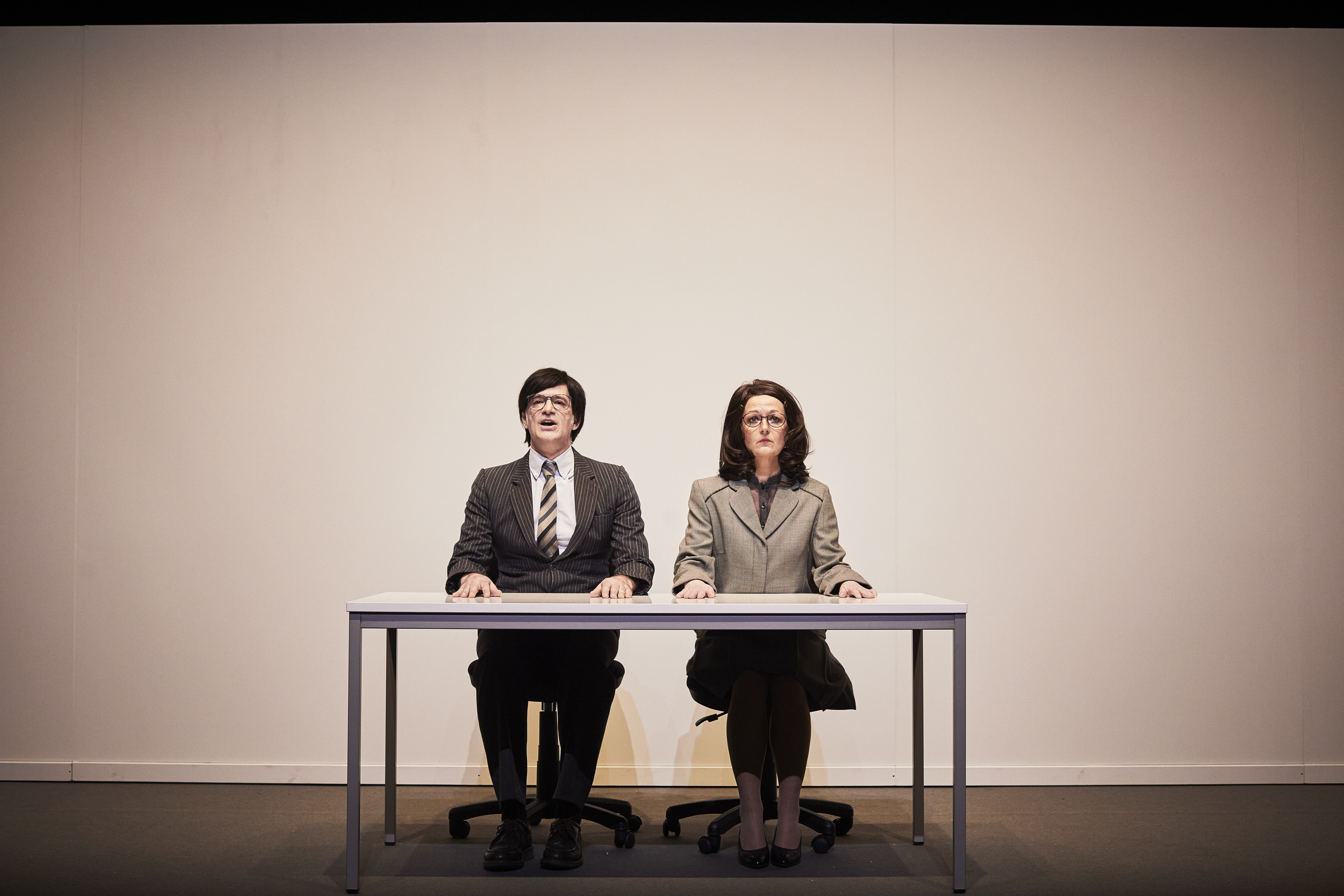 Anne Girouard et Olivier Dutilloy, dirigés au plus près par Anne-Laure Liégeois, sont tout simplement phénoménaux. Employés au bord de la crise de nerf, le verbe et le corps tout entier engagés dans cette bataille homérique pour une augmentation qui ne viendra jamais, qui les voit errer pour jamais dans les couloirs de ce consortium qui les broie, rivés immuablement sur leur bureau, dans cet espace impersonnel, ils vont obstinément jusqu’au bout d’une folie qui les ravage bientôt, enfermés dans un système proprement kafkaïen. Jouant avec adresse de ce texte impossible, de ces chausse-trappes, de ces répétitions jamais vraiment identiques et de plus en plus décalées, lui imposant un rythme qui va toujours crescendo, ils osent avec raison et talent la franche démesure en tout point en restant par miracle d’une justesse épatante, sans être jamais ridicules. Mieux encore, d’une humanité bien désarmante derrière la bouffonnerie. Qu’ils soient ces employés obtus et misérables, aux menues victoires fragiles et éphémères, ou qu’ils endossent tout à tour le rôle du chef de service sourd à toutes revendications, parfois mais rarement compatissant, parfaitement odieux jusque dans sa feinte générosité, ils sont d’une virtuosité vertigineuse dans leurs compositions hallucinantes et totalement déjantées, parfaitement assumées et maîtrisées cependant. Il n’y rien de trop, rien de gratuit et Anne-Laure Liégeois ne lâche pas le fil du texte et de sa mise en scène noués serrés, qu’elle tient fermement tendu, avec intelligence, jusqu’au bout. On rit sans vergogne au long de cette représentation jouissive et désopilante, aussi abrasive qu’explosive, et ce depuis les premières minutes où pourtant il ne se passe rien, strictement rien, sinon une intense concentration de ces deux-là, emperruqués et vêtue de gris, en vrais modèles d’employés lambda, les mains bien à plat sur leur bureau, prêt à s’engouffrer dans une demande qui les mènera défaits au bout du bout d’eux même, autrement dit nulle part, où tout sera encore à recommencer.
