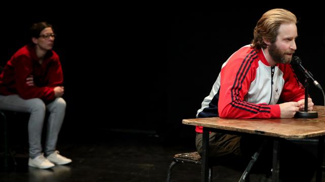« L’avantage du doute », ils sont cinq, s’en donne à cœur joie dans la satire, bien vue, de notre société du spectacle. Sur ce plateau d’enregistrement minable et non chauffé, fait de bric et de broc, mais éthique, pêle-mêle sont abordés et sabordés notre rapport à l’image, certes, mais surtout notre capacité à résister devant les compromissions. L’engagement politique, l’utopie des lendemains qui déchantent, le refus d’une société médiatique où l’information et le divertissement ne font plus qu’un dans une mise en scène obscène quotidienne sont très vite et avec beaucoup d’humour ébranlés devant l’audimat qui s’emballe devant le nouvel habillage proposé. C’est une vision au vitriol mais qui évite le discours asséné pour un jeu de massacre plus ou moins feutré où l’intime et le collectif étroitement imbriqués se répondent. Hilarantes conférences de rédaction où les cheveux sont coupés en quatre et plus encore, qui dessinent un portrait en creux de chacun d’entre eux et révèlent leur fragilité devant un système qu’ils combattent. Système soumit  brutalement à l’audimat imposant jusqu’aux tenues des journalistes et la mise en scène de l’information politique comme un vulgaire et obscène fait divers. Et puis il y a des intermèdes poétiques qui les voient traverser un petit pont rouge pour atteindre une vérité insoupçonnée, l’envers d’un discours officiel où « viennent à eux les fantômes ». Pur moment de grande solitude où les images révèlent leur vérité. C’est parfois un peu long, c’est vrai, particulièrement cette histoire d’amour qui s’imbrique, plus soap-opera dans son propos et les clichés véhiculés, sans doute volontaire, mais cette vision particulièrement aigüe et acérée d’une société soumise aux médias et broyant les idéaux est particulièrement pertinente. Et puis cette façon de jouer, cette adresse directe au public entre confession, révélations et incises de citations littéraires, cultivant l’ambigüité entre le personnage et l’acteur, évitant toute distanciation fait de cette création plus une performance, une expérimentation en direct avec le public pour témoin, inclus dans le processus en cours. C’est un drôle de truc en somme, oscillant entre réalisme et sa dénonciation, qui contourne son objet et son discours pour mieux le cerner et le dénoncer. Une immersion réussie, drôle et assez intelligente pour ne pas tomber dans les pièges d’une dénonciation univoque. Parce que les utopies sont encore possibles, même si les rêves sont élimés et le présent désastreux à l’image de Simon. Bref, une création éthique et authentique.