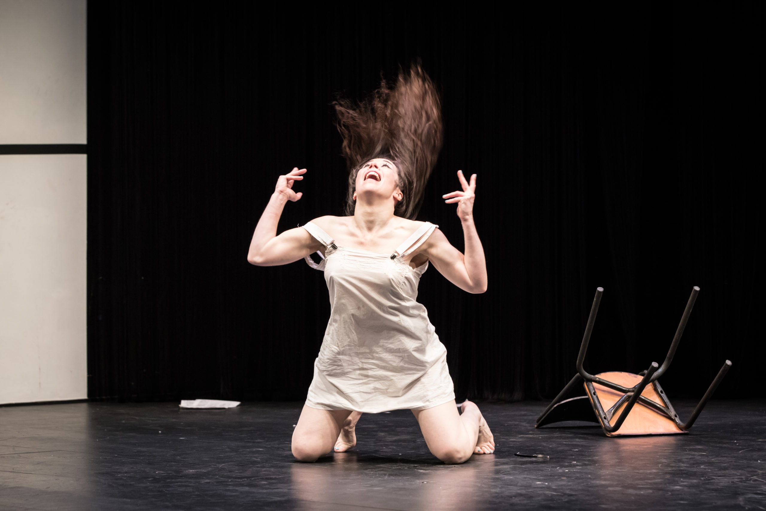 Karell Prugnaud exprime la figure de Lucia dans un corps à corps avec le verbe d’Eugène Durif à la manière Isadora Duncan. Elle jette dans l’espace des vibrations, crée des images, tout est mouvement, rythme, poésie. La comédienne danseuse est cette folle à la vitalité débordante, brutale, provocante, érotique, rendue catatonique par les injections. Karell Prugnaud est d’une extrême précision, du bout des doigts à la plante des pieds, sa diction est ciselée.