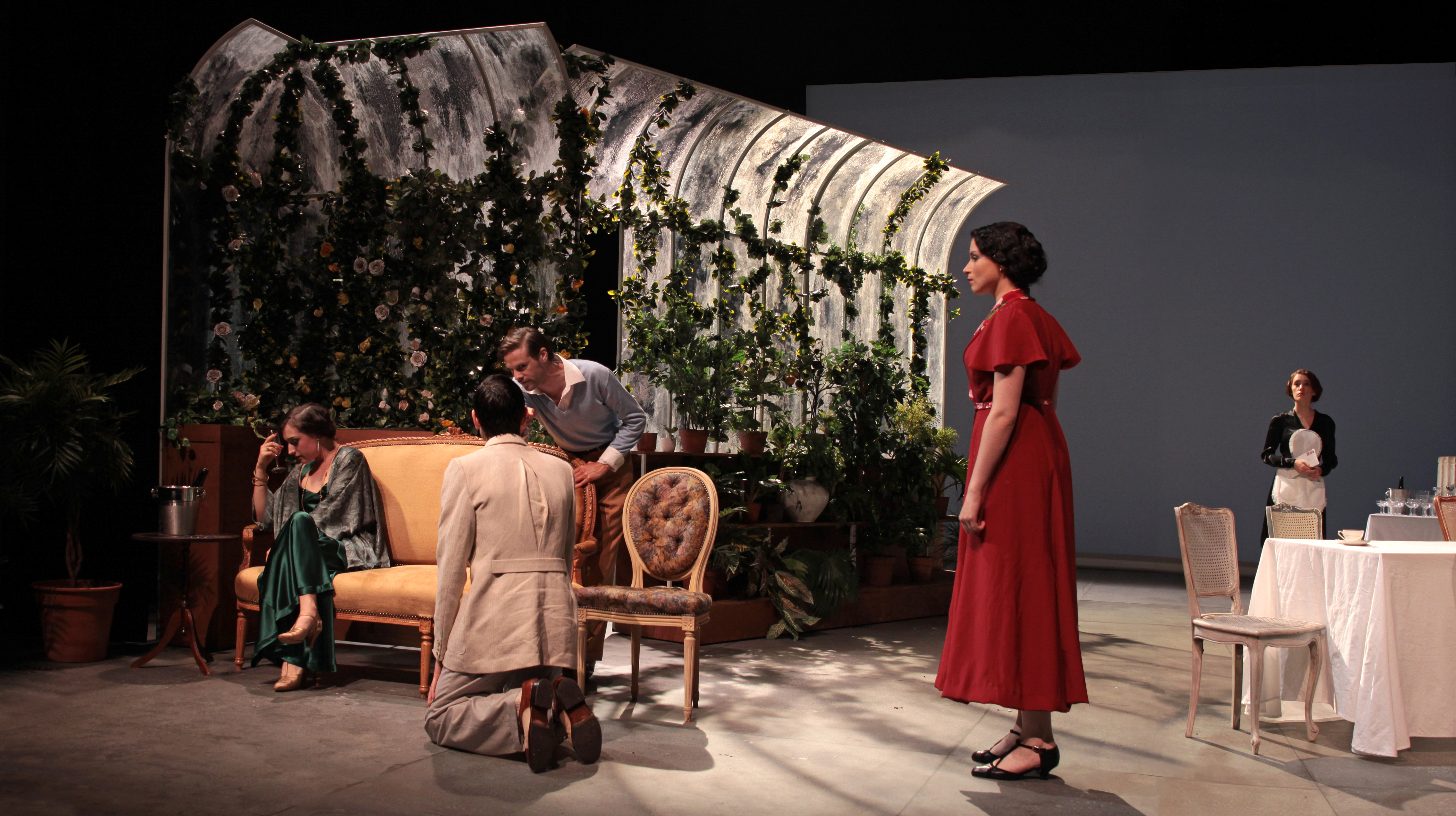L’ENSATT forme des comédiens et comédiennes, mais aussi des costumiers, des scénographes, des administrateurs, des régisseurs… Cette « restitution » de travaux d’élèves, en conséquence, est un spectacle remarquablement abouti, qui ferait rougir bien des productions « professionnelles ». Rien à dire sur les lumières et les sons. Il n’y a pas un centimètre de trop à la petite chaussure noire de « Scrupule » ; il ne manque pas le moindre petit brin d’herbe folle au bas des pierres tombales du Chemin de fortune. La serre du Legs, chargée de plantes vertes, la longue table en avant-scène, la table ronde au lointain, le petit canapé à jardin, le seau à champagne avec le bon nombre de glaçons qui feront juste le bon bruit quand on y reposera la bouteille sont tout simplement parfaits. Les acteurs et actrices, dans la fougue de leur jeunesse, jouent une partition parfois inégale, mais forcément riche de promesses.