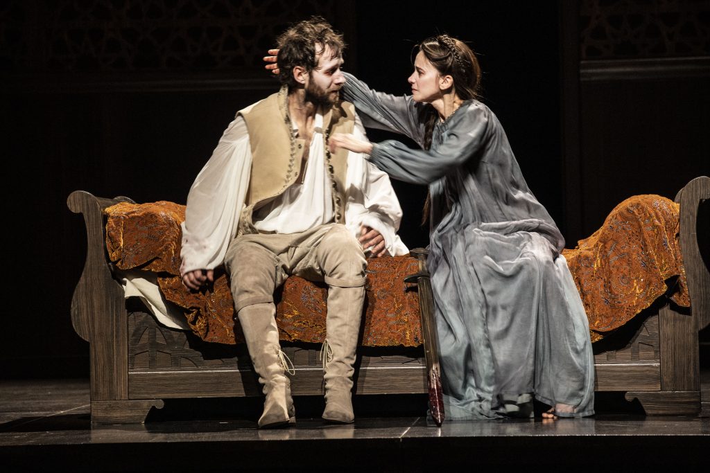 Chimène, c’est Suliane Brahim qui en impose autant que Benjamin Lavernhe, avec qui elle forme un couple tragique exemplaire. La confrontation des deux, deux scènes particulières d’une douceur étrange au regard de la violence de la situation, est un sommet où l’émotion nait non de ce qu’ils se disent mais, comme cette épée couchée entre eux – tout un symbole – de ce qui sous-tend désormais leur relation devenue par force conflictuelle. Suliane Brahim est littéralement transportée, chahutée par un vers qu’elle maîtrise à la perfection, qui toujours contrarie son personnage dans ses résolutions, trahit ses intentions, vers auxquels elle s’abandonne par une compréhension intime, qu’elle sublime ainsi avec une remarquable intelligence dramatique et qui mène Chimène au bout d’elle-même, de ses contradictions, jusqu’à la déraison qui n’est pas folie mais l’expression d’un dilemme obsessionnel la déchirant que résume ce vers lapidaire « Dedans mon ennemie je trouve mon amant ». Suliane Brahim vous bouleverse tout autant que son partenaire, toute entière et sans retenue aucune dans ce désespoir rageur et sans issue qu’elle porte en sautoir comme malgré elle où le deuil d’un père induit par devoir le deuil d’un amour auquel elle doit renoncer sans pouvoir y parvenir.