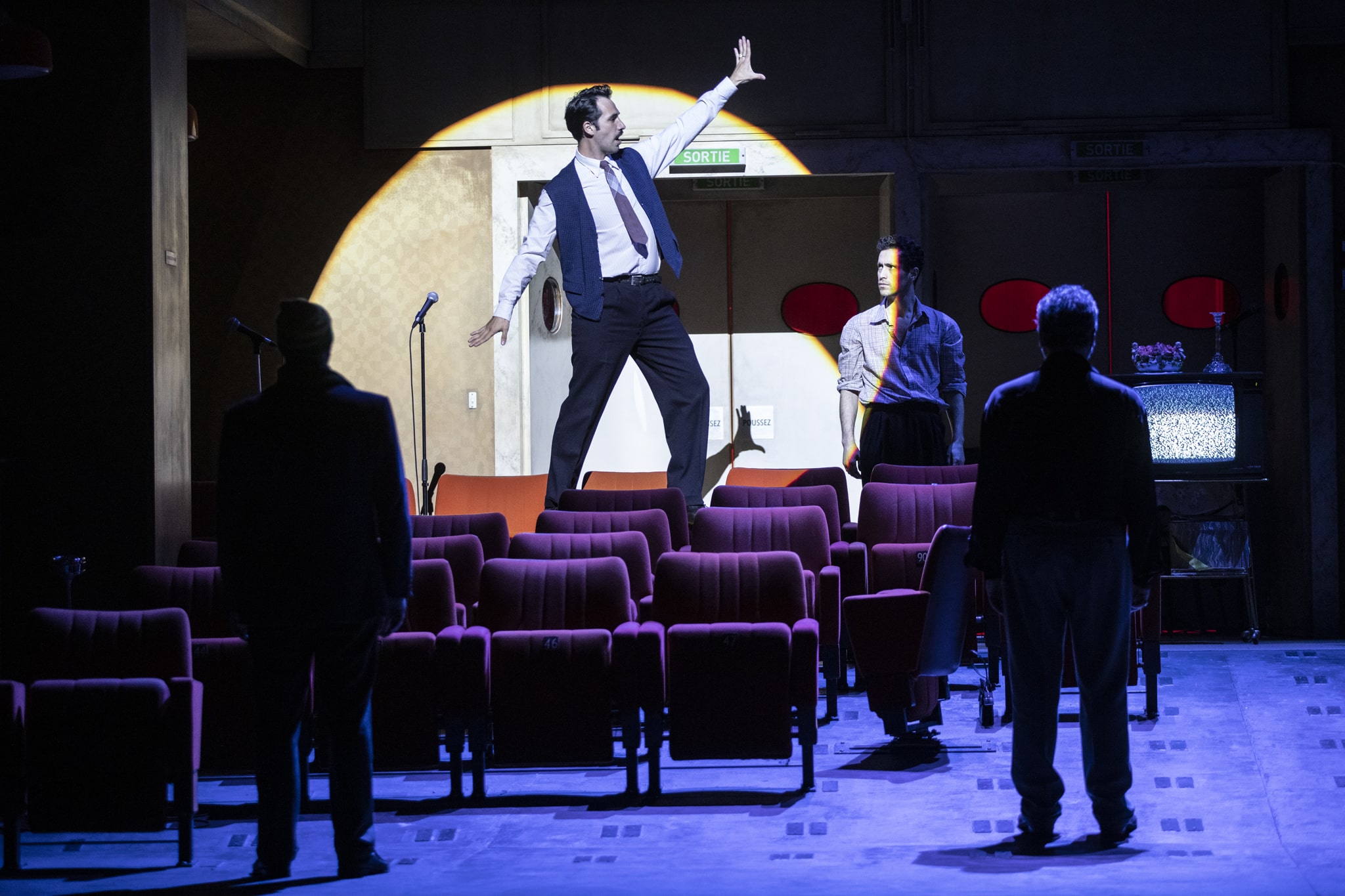Ce qui se passe là, sur ce plateau, une salle de cinéma de quartier, est tout simplement du grand art. Christophe Honoré met en scène avec brio le roman d’une famille, d’une époque, avec une sensibilité d’écorché vif, de celui qui sait que le cinéma et le théâtre font œuvre de vie, de mémoire, capables de mettre la distance nécessaire et juste au récit autobiographique. De convoquer les morts même. Mais ici le théâtre prend en charge l’échec du cinéma à porter cette histoire sensible, comme il est le lieu d’un cinéma impossible. De ces tragédies familiales il fait fiction sans doute parce que le souvenir des évènements vécus n’est qu’une partie de l’évènement, un point de vue, voire une émotion ressentie, une vérité inavouée, inavouable. A chacun ses souvenirs, une partie de la vérité. Ce qu’il met en scène là, c’est la mémoire éclatée des faits, combien elle est toujours diffractée, jamais univoque. Et les personnages ne se reconnaissant pas, reprennent en charge le récit de Christophe Honoré, de son avatar, qu’ils contestent, donnent la version de leur histoire, se réapproprie leur existence. Et ils sont formidablement grands et virtuoses ces sept-là qui, unis indissolublement sur le plateau, donnent corps et âmes, couleurs, aux ombres décolorées du passé. Dirigés au cordeau – il y a là une véritable direction d’acteur, une vraie et belle complicité d’eux à lui – ils donnent à chacun de leur personnage une terrifiante et bouleversante humanité déchirée de violences, clouée par le déterminisme. Et cette brutalité comme inhérente à leur condition immuable à leurs yeux, ils l’a transfigurent pour leur offrir non pas une rédemption, pas même une excuse, mais un foutu destin dérisoire et grandiose de ceux qui ont fait comme ils ont pu. On gueule, éructe, pleure, rit. On danse sur Sheila, instant d’une tendresse fulgurante et qui vous poigne. On regarde le match de foot, supporter inconditionnel des « Canaries » et qui réconcilie le temps d’une victoire. On picole sec. On se confie, les morts chuchotent aux vivants les secrets tus qui empoisonnent, éclairant d’une lumière crue votre présent sourdement, incompréhensiblement chaotique. Dans ce vieux cinéma de province chacun refait le film à sa façon, nouant et dénouant pour les vivants les fils qui les relient encore. Pour mieux l’en libérer. Christophe Honoré remonte ainsi la généalogie des secrets qui poissent dans une mise en scène brillante qui lentement vous submerge, vagues après vagues. De tension en points de rupture, d’accalmies en orages brusques, Christophe Honoré accompagne ainsi au plus près le rythme de chacun des personnages au fil des révélations et des non-dits sans jamais rien lâcher de l’ensemble. Acteurs et spectateurs tout à la fois d’un récit qu’ils reconstituent à l’aune des vérités insoupçonnées tombant drues et qui font ainsi avancer par sauts brusques le récit jusque dans sa fragile résolution. Et nous sommes là, nous spectateurs, pris dans ce maelstrom étourdissant avec une drôle de sensation, non pas malaise, mais une émotion brute, troublé par ce jeu-là, cette histoire-là, qui tambourine et ne vous lâche plus. Car ce qui palpite là, c’est la vie, aussi moche soit-elle.