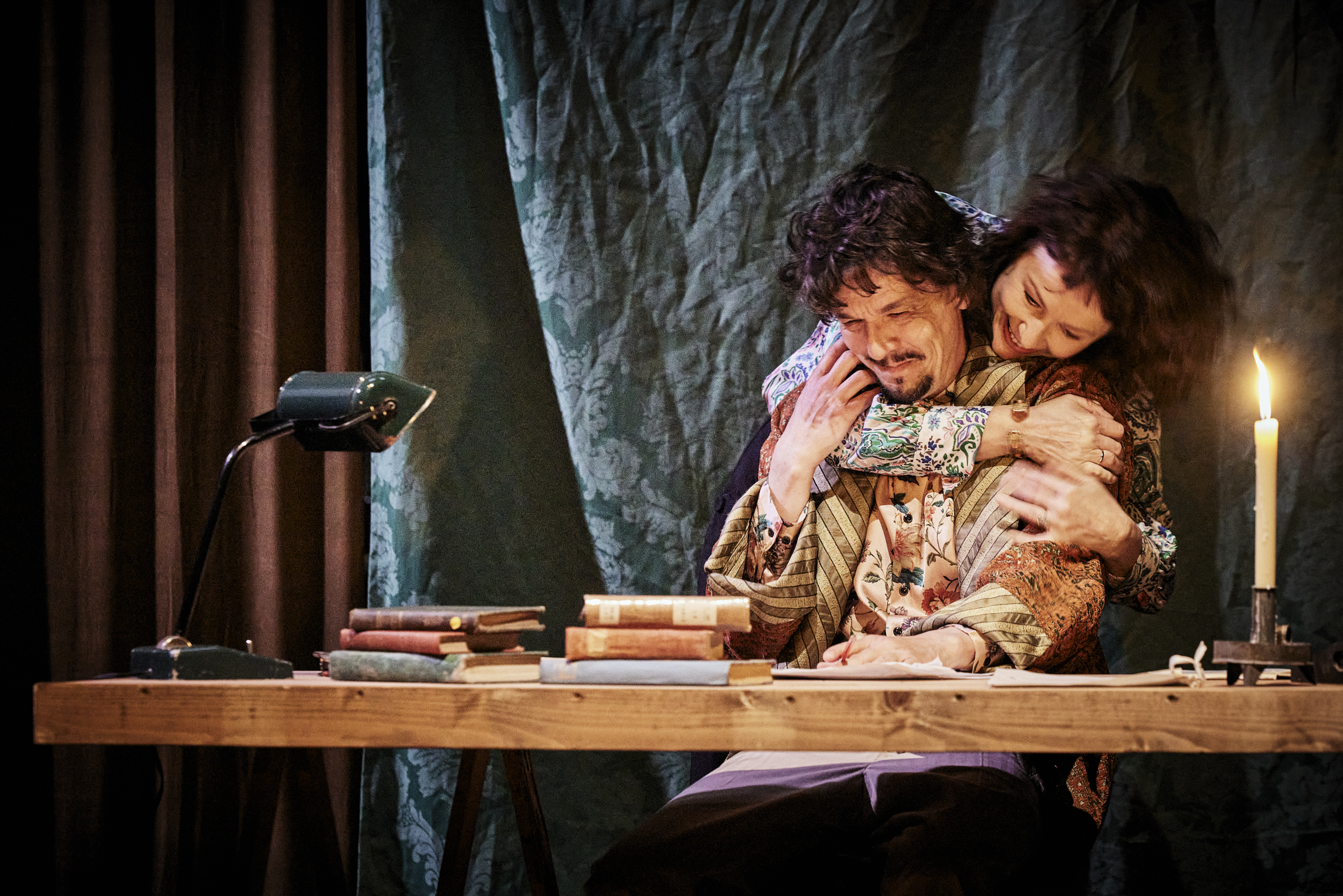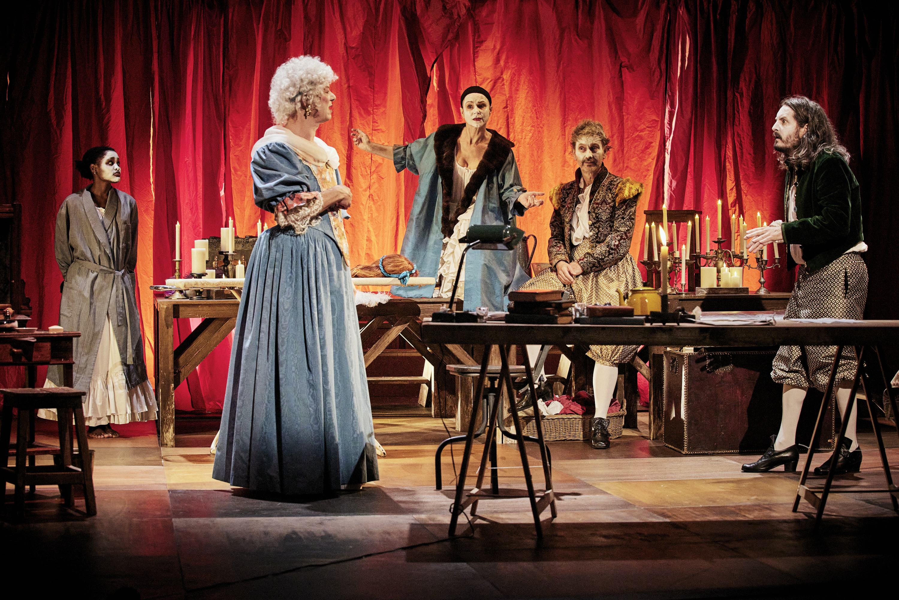 Boulgakov, Molière, le destin de deux écrivains, protégés par le pouvoir et soumis paradoxalement à la censure par ce même pouvoir. Deux vies, deux œuvres mises en regard, destin parallèle ou le second éclairerait de ses feux le premier, témoignage aussi de la résistance de la littérature, de l’imaginaire, à toute tentative d’oppression et de mise à mort. Louise Vignaud et Alice Cosson interrogent dans cette création, qui est un bel hommage au théâtre, les rapports ambigus entre le politique et l’artiste. Boulgakov admirait Molière, La cabale des dévots (1929), pièce sur Le Tartuffe et son interdiction et surtout son remarquable Roman de monsieur de Molière (1933), refusé à la publication, en témoigne. Alors pourquoi ne pas faire se rencontrer ces deux hommes ? Un soir, qu’après avoir reçu notification que toutes ses pièces seront retirées de l’affiche, ses romans retirés des bibliothèques, et malgré l’admiration que lui porte Staline, Boulgakov désespéré reçoit la visite des poètes Boileau, Chapelle et La Fontaine. Nous sommes au théâtre, tout est possible. Et ces trois-là, l’emmènent illico rencontrer Molière − il suffit d’ouvrir comme au théâtre un rideau pour qu’opère la magie − au sortir Des Précieuses ridicules. Pièce soumise à la vindicte des précieuses, représentée par Madame de Rambouillet, exigeant dans une scène cocasse − Thierry Hancisse est hilarant dans ce personnage plus dragonne que précieuse − de retirer la pièce ou de lui apporter de sévères modifications. Et c’est ainsi que l’on pendule de la loge de Molière au bureau de Boulgakov, d’un siècle à l’autre, le plus naturellement du monde, avec une belle fluidité. Rien qui n’étonne donc, en cela nous retrouvons l’esprit de Boulgakov, celui injecté dans le roman Le maître et Marguerite. De tableaux en tableaux, où l’imaginaire s’émancipe de la réalité, où le théâtre balaye pour un temps toutes inquiétudes, où les coulisses sont l’enjeu d’une bataille pour la survie d’une œuvre et de sa propre vie, Louise Vignaud et Alice Cosson établissent un étrange jeu de correspondance, réelle ou fictive, certaines figures semblant se superposer comme un seul et même visage, d’une époque à l’autre, soulignant une communauté de destin. L’histoire, même réinventée, est un éternel recommencement. Et s’il est une belle réussite ici, elle est sans nul doute dans les scènes de théâtre, celui de Molière, où la troupe de L’Illustre Théâtre, entre masques et visages fardés, impose au roi son talent. Théâtre de tréteaux flamboyant qui se délite au fil de la représentation, il n’y aura bientôt plus que cendres dans les coulisses du Théâtre d’Art de Moscou hantés par les purges staliniennes. Et si étrangement Boulgakov et Elena Sergueïevna Boulgakova évitent le destin de Meyerhold, exécuté, et Elena Sergueïevna Zinaïda Reich, assassinée, – car il est aussi ici question de l’importance des femmes – la mort néanmoins est en filigrane de cette création. Où la résistance d’une œuvre est la survie de l’artiste condamné par le pouvoir et ses enjeux. Une scène fort drôle résume parfaitement cette ambiguïté, où louis XIV, jouée avec finesse par Géraldine Martineau, reçoit successivement l’archevêque menant cabale contre Le Tartuffe et Molière pour sa défense. L’ensemble de la distribution fait montre encore une fois de l’excellence actuelle de la troupe du Français (ajoutons, délicieuse ironie, Éric Ruf prêtant sa voix pour le rôle de Staline…), auquel il faut ajouter désormais Nicolas Chupin dans le rôle de Molière et dont ce sont les premiers pas dans la Maison, donnant à cette création ne manquant pas de qualité mais un peu trop sage et qui aurait mérité sans doute plus d’âpreté, une dynamique qui lui manque parfois.