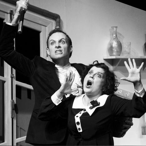 Entre les pans obliques et gris d’un décor de guingois, les scènes empruntent au cinéma muet, entremêlant silence et chansons dans des postures explicitement outrancières et, surtout, avec une bonne dose de second degré totalement assumé. Florence Andrieu et Flannan Obé nous charment de leur pétillante justesse : tout fleure les débuts du cinématographe, entre effluves d’Yvette Guilbert et exhalaisons de Murnau. Derrière le sourire timide de Joséphine, brille le regard humide de Louise Brooks et la longue silhouette d’Albert attendrit autant que les maladresses de Keaton. Et, il y a aussi le pianiste ! Dans la salle, face à la scène, il (Philippe Brocard) fait partie intégrante du spectacle et déploie sa maestria avec un enthousiasme communicatif. Comme on rit et comme le temps file en compagnie de ces trois-là ! Et je n’ai pas encore parlé des intermèdes, prologue, entracte et épilogue, ponctuant la soirée d’apparitions chantées, de tours de magie ou de réclames… Un régal ! Costume rayé et fraise de clown à la Sjöström, les deux comédiens nous ravissent de leur inventivité et l’on s’étonne souvent qu’ils ne soient que deux sur scène… heu, pardon ! trois…