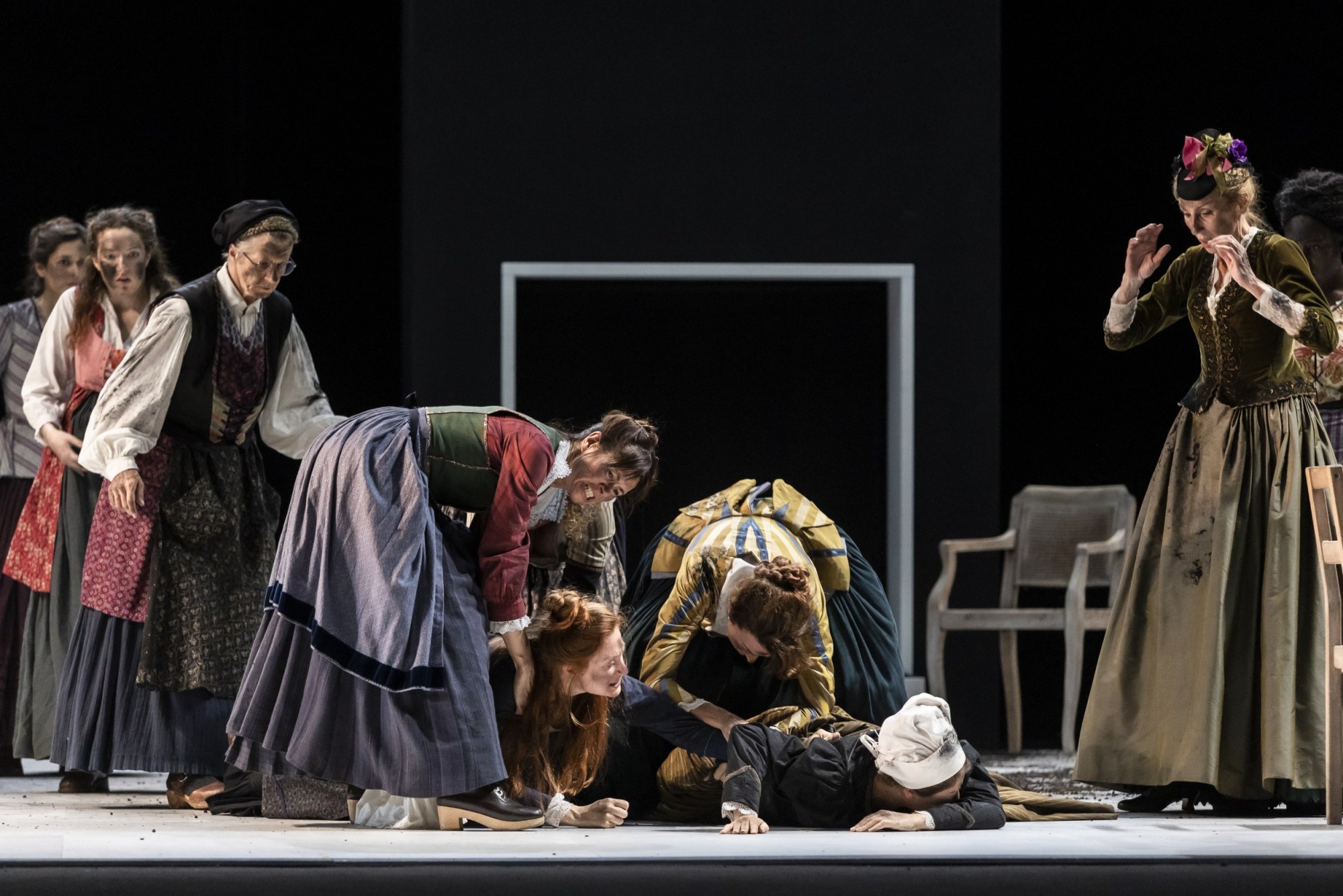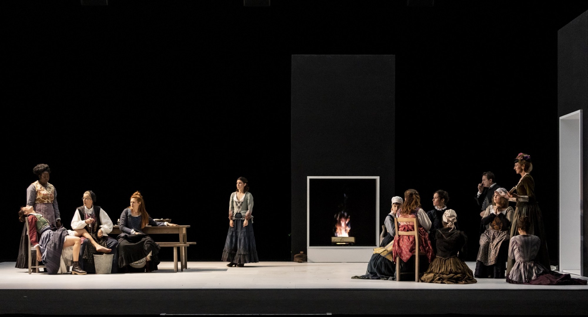 L’Histoire n’est pas un décor mais elle habille les corps. Il n’y a d’ailleurs pas de fond de scène, juste un noir profond sur lequel les personnages se détachent. Chacune, chacun, vignetté tel ces profils découpés dans le papier et popularisé par Etienne de Silhouette au XVIIIème siècle. Chloé Dabert met en œuvre cette esthétique des contours qui rend compte des corps, de leurs usages, de leurs postures, de leur asservissement, de leurs fatigues… C’est à une succession de tâches ménagères que nous assistons dans un prologue vidéo : lessivage, balayage, barattage, filage, plumage… Corps plié, tordu, accroupi… Corps sans repos, corps rompu à l’utilité, rythmé et aliéné par sa tâche. Dans les scènes du tribunal, ce sont des amas de corps, des attroupements, des affrontements, dont la composition est particulièrement léchée se révélant à la lumière pareille à des tableaux d’Ingres, de toute beauté.