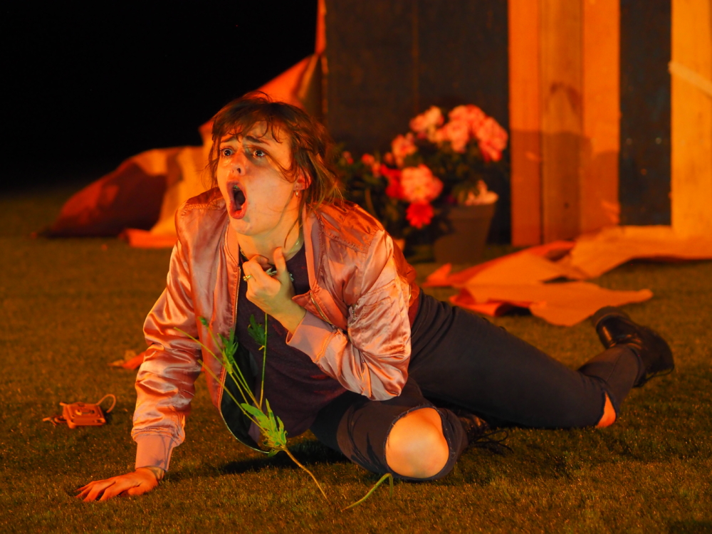 Une femme enceinte endormie sur un transat, une pelouse synthétique qui évoque les beaux jours, les restes d’un anniversaire jonchant le sol ; une atmosphère paisible, un avenir heureux, un moment doux comme une sieste au soleil après un moment festif… Si ce n’était le titre du spectacle, on pourrait croire à cette douceur qui se dégage de cette ouverture. Pas de tergiversations inutiles, ni grandiloquentes, Elsa Granat n’y va pas par quatre-chemins, elle s’engouffre directement dans la brèche : à peine commence-t-elle à parler à cet enfant à venir, qu’elle évoque en creux, l’absence de la grand-mère qu’il aurait dû avoir… Et c’est parti pour un voyage fantasmagorique dans l’esprit de cette future maman. Elle se remémore cette période terrible où la jeune femme tout juste sortie de l’adolescence à perdu sa maman d’un cancer foudroyant, avant d’apprendre quelques semaines après que son père souffrait aussi de cette maladie. En nous invitant à l’intérieur de ses souvenirs, Elsa Granat vise juste, et puissamment, car plutôt que le déroulement réel des faits, c’est son ressenti d’alors qu’elle nous partage, c’est via le prisme de cette adolescente que l’autrice-metteuse en scène rejoue le traumatisme de la perte de ses parents. Excellente et efficace idée de nous faire entrer à l’intérieur de son cerveau et de ses émotions, cela permet d’éloigner à la fois le pathos et l’inutile besoin de vraisemblance. Au contraire, le dialogue improbable entre la femme, l’adolescente et la « vieille femme qui s’est pris 60 ans dans la gueule » avec ces cataclysmes, nous mène sensiblement au cœur de ce parcours du combattant qu’est l’accompagnement d’un parent vers la mort, et le deuil qui lui succède.
