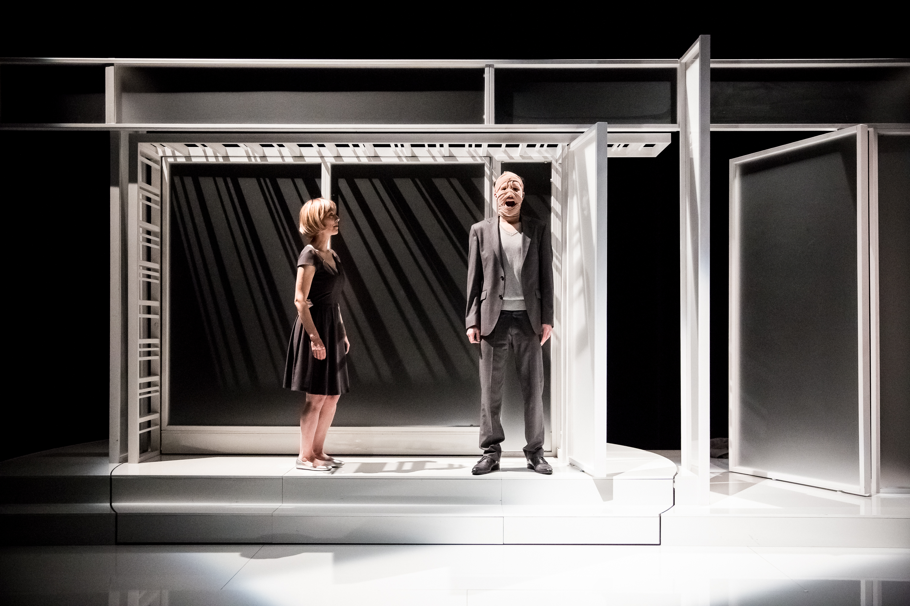 A l’Atalante, plus d’œil du prince, mais le seul œil du spectateur, justement. Le dispositif est brut et immédiat : les acteurs arpentent déjà la scène quand les spectateurs font leur entrée. Sur le petit plateau du théâtre, les visages et les corps des « interprètes » sont cruellement livrés aux regards proches, très proches, du public. Le « moche » du titre a le physique ordinaire et élastique de Guillaume Marquet : on peut le trouver beau, on peut le trouver laid, ce n’est pas là la question. L’opération de chirurgie esthétique qui, dans la fable, change radicalement sa vie ne change rien sur le plateau : c’est le visage inchangé de Guillaume Marquet qui, après avoir suscité la répulsion, exerce désormais une attraction fatale. Et lorsque, à la fin de la pièce, Lette se réconcilie avec son double, c’est à un acteur à qui il ne ressemble pas qu’il s’adresse. Le théâtre de Mayenburg s’amuse donc des écarts entre texte et incarnation, défiant des siècles d’illusion comique, sous les yeux d’un spectateur qui ne sait décidément plus à quel persona se vouer.