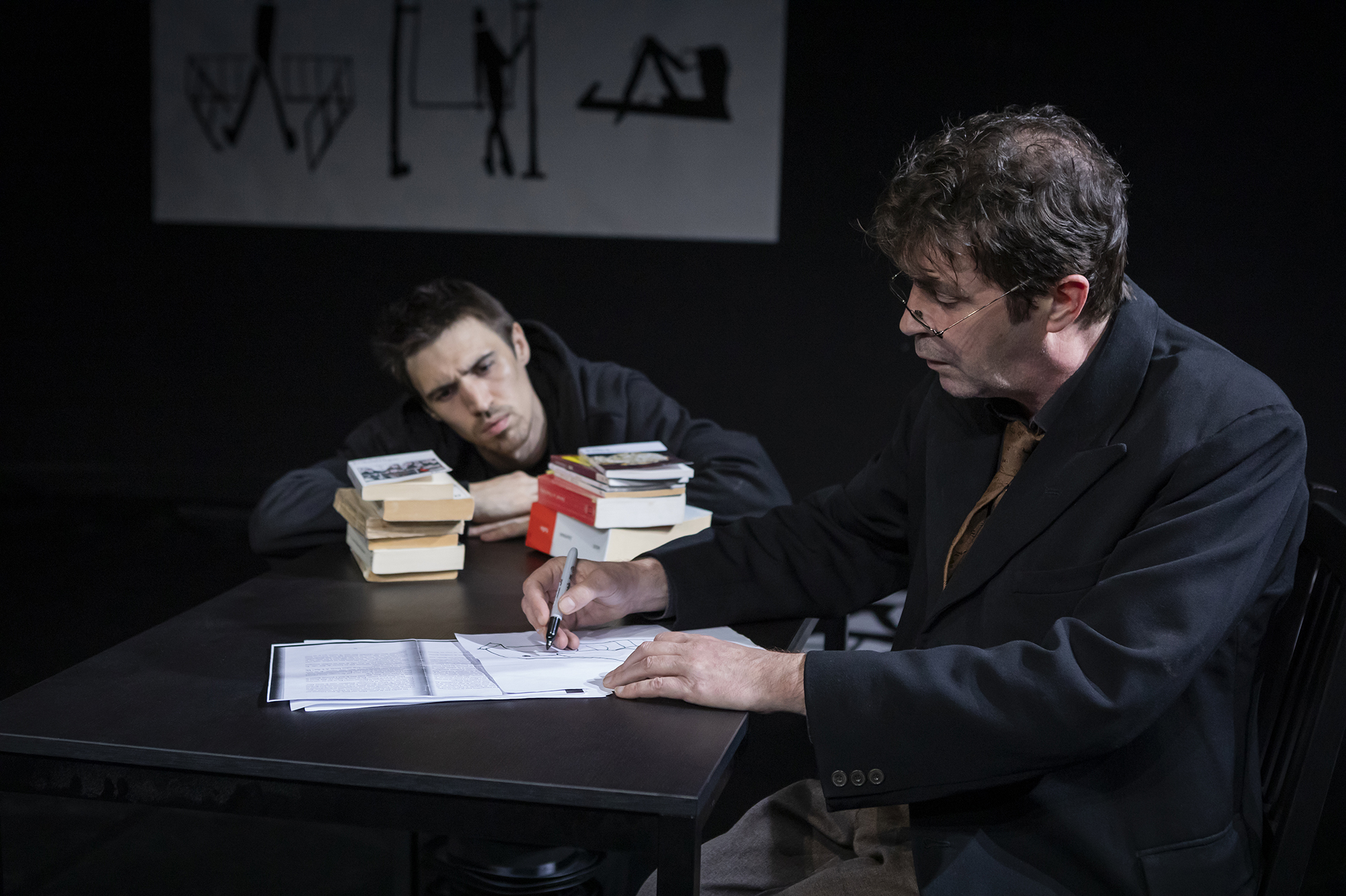 De la ressemblance, il y aurait beaucoup de chose à dire, et d’abord, qu’elle est cette magie capable de faire coexister en une personne unique deux êtres pourtant distincts. Dans la ressemblance il y a des lignes de convergence, et d’autres qui s’éloignent. Il y a un écart, forcément, et dans cet écart, plus ou moins grand, se glisse l’acteur. Qu’un acteur dise, d’entrée de jeu, « on m’a souvent dit que je ressemblais à Kafka », et pour le spectateur c’est tout un jeu du chat et de la souris qui démarre. L’exercice est ici d’autant plus vertigineux que Leslie Kaplan dresse en quelque sorte le portrait de Kafka en creux du portrait de l’acteur, Marc Bertin, ou vice-versa.