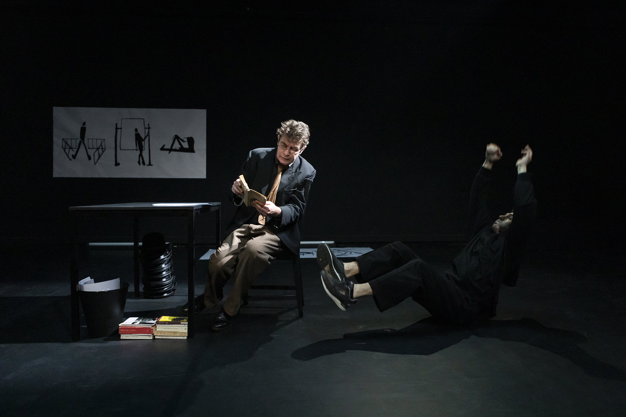 Le monde et son contraire est empreint de cette dualité formelle, l’acteur étant rejoint par Jim Couturier, le danseur. Se compose alors un étrange pas de deux, sans que jamais l’on ne démêle lequel précéderait l’autre, récit et mouvement comme deux fils emmêlés. Le danseur, tout de noir vêtu, sweat à capuche, comme une ombre portée, tête en bas, telle une idée qui se déploierait en toute liberté, faisant fi de toutes les lois, de la pesanteur et des autres. Le ballet de Jim, si l’on ose l’appeler ainsi, ne fait aucunement diversion au récit de Marc, l’inscrit au plateau comme les lettres typographiées l’écriraient sur la page planche d’un livre. Allons plus loin : cette danse serait comme la chanson de geste indomptée de la pensée, divagante, ironique sur le monde, avant qu’elle ne se condense et réduise à une parole, à un écrit.