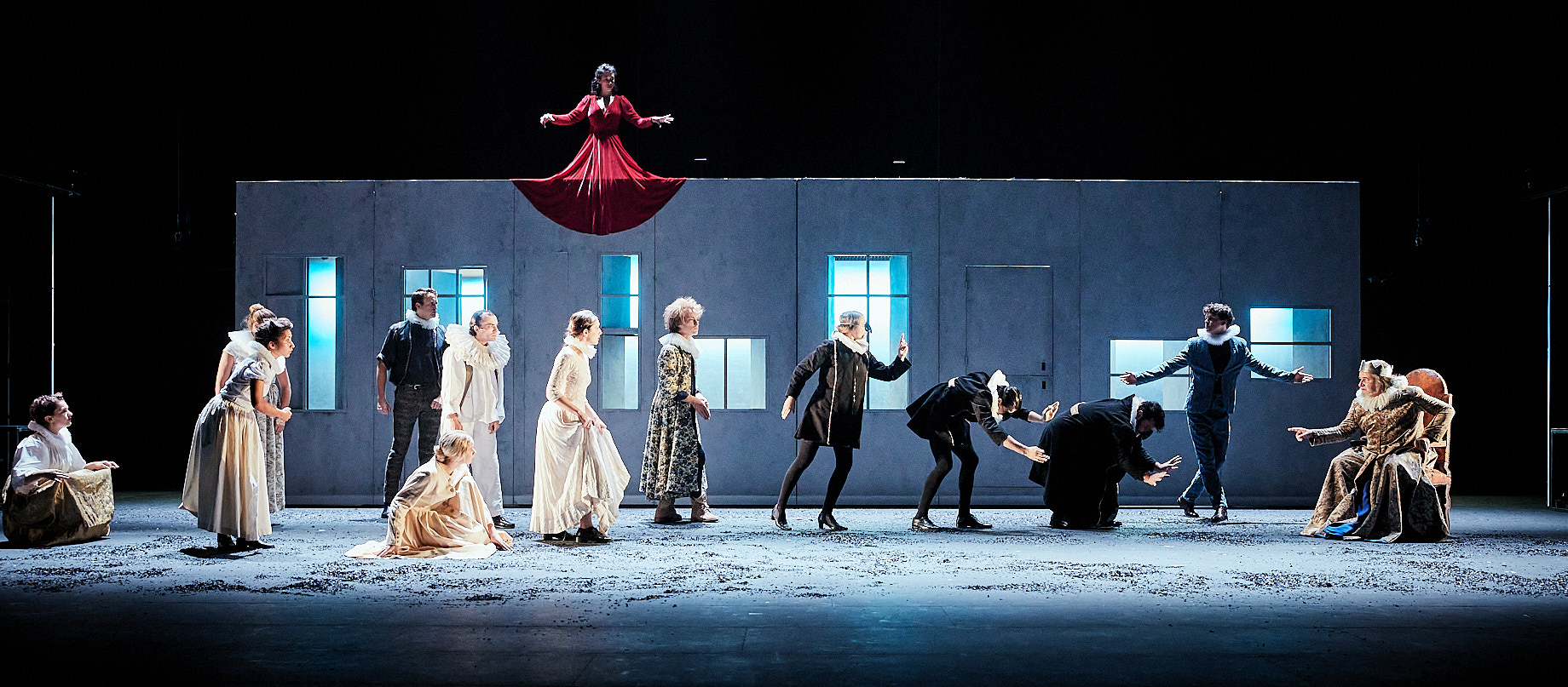Le Nid de cendres comme son grand frère Ma jeunesse exaltée d’Olivier Py, auquel il rend un hommage discret par la présence de servantes (lumière sur haut pied qui reste allumée quand le théâtre est fermé) en écho à son spectacle éponyme, est une déclaration d’amour au théâtre et fait vivre au public une sorte de communion théâtrale. On entre dans Le Nid de cendres immédiatement, sans effort, d’abord pris par la main par la belle Sarah dans sa grande robe de velours rouge (formidable Camille Constantin da Silva) qui vient (notamment car chaque comédien joue au moins 3 rôles) assurer les prologues et toutes les transitions, amusant par ailleurs beaucoup le public par ses recommandations et sa satisfaction, après comptage, de le voir encore présent et à l’heure après chaque interruption. « C’est du masochisme ou ça leur fait du bien » demande-t-elle à son père ? « Un peu les deux » sans doute. Ce n’est pas faux… Tous ces compagnons et compagnes d’épopée méritent d’être cités, car ils contribuent tant par leurs individualités marquées que par leur évidente énergie collective à cet esprit de compagnie qui semble évident jusque dans les saluts. John Arnold est vraiment un roi de conte de fée, superbe dans sa magnificence comme dans sa déchéance, et un chef de troupe de théâtre itinérant (« Le théâtre des campagnes ») bienveillant, sans être trop paternaliste, acharné au travail, et soucieux des détails, évoquant Molière, jusque dans le nom d’Argan qui lui a été attribué. Charly Fournier campe un président (Hollande) devenu cartomancienne irrésistible, assurant un autre joli rôle tout de blanc vêtu, du Temps, dont l’idée n’a pas été assez exploitée ou insuffisamment utilisée au long des 13 heures de spectacle. Mathias Zakhar joue à merveille M. Badile, diablotin souvent, inquiétant parfois, doublé d’un valet simplet irrésistible. Lorenzo Lefebvre est un Gabriel solaire (avec des faux airs de Chéreau par moments très étonnants) jusque dans son déclin face à ce mal aimé de frère qu’il a lui-même contribué à faire nommer Brock, un « nom de clown », un clown triste devenant tyran, personnalité à fleur de peau que Charlie Fabert incarne idéalement. Frédéric Dockes offre un touchant Didi, Elise Douyère une émouvante Etoile, Mathilde Charbonneau est exaspérante à souhait en Reine blasée et cruelle et en Bélise impatiente et autoritaire. Tous les rôles de vraies héroïnes de contes ou du quotidien sont jouées par des comédiennes sensibles et délicates, telles Anne Duverneuil en Sophie, Victoire Goupil en Oerine, Pia Lagrange en princesse Anne, Charlaine Nezan en Louison et Manon Rey en Julie. Simon Falguière lui-même s’offre comme les autres comédiens plusieurs rôle dont celui de l’énigmatique comptable qui n’a pas de nom (qui pourrait être un M. K en hommage au nom de la compagnie) Stanislas Perrin est le géant-Jean, un époux et père inquiet et fiévreux, mais qui saura dans la générosité et la discrétion protéger ses deux êtres les plus chers. Son histoire personnelle est une illustration de l’universalité des drames intimes que subissent les humains tout au long de leurs propres odyssées, et auquel chacun apporte les réponses qu’il peut.