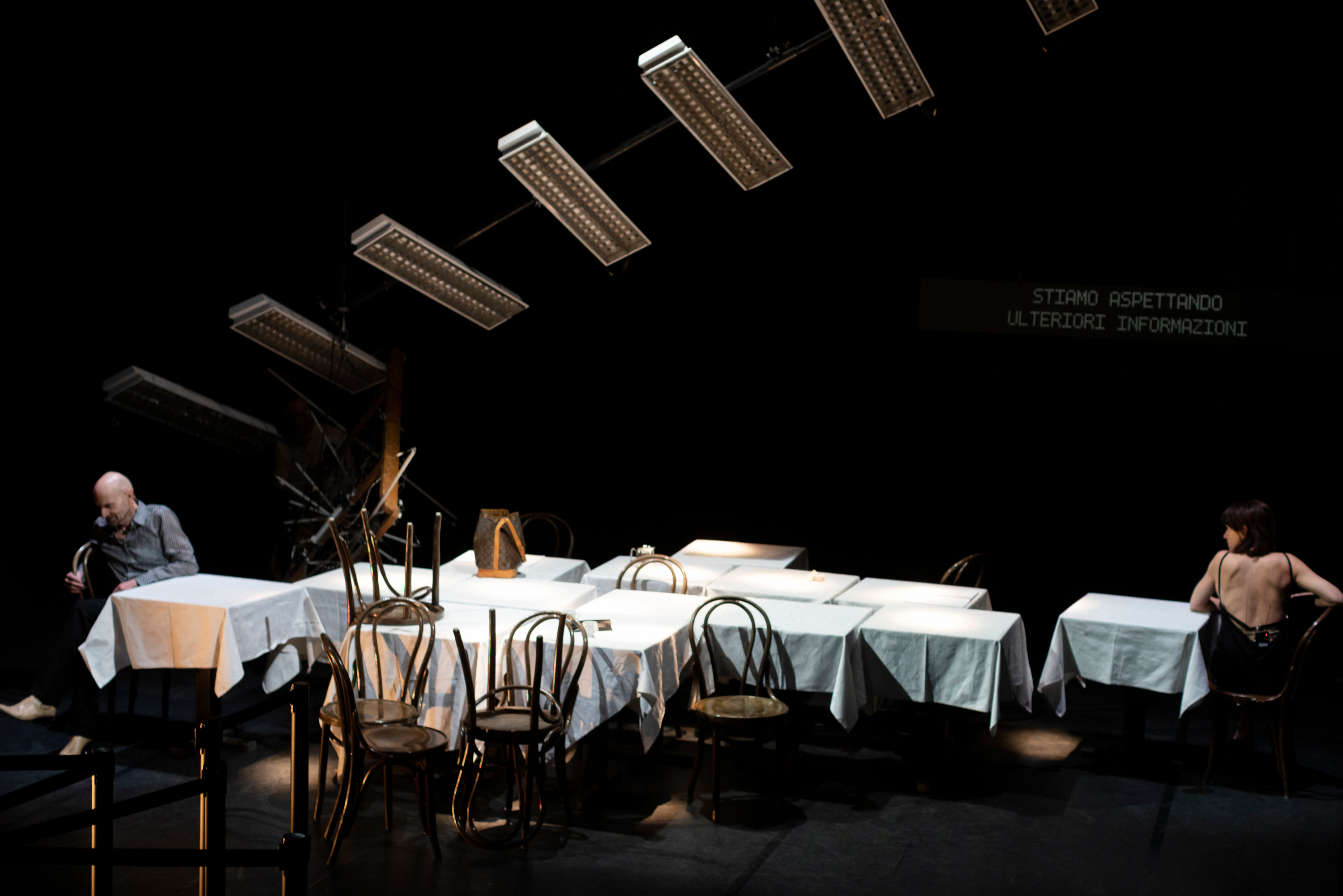 Il y a vingt ans ils s’écharpaient, à propos de tout et de rien, d’un frigo, de la chapelle Sixtine, de l’art baroque, d’un voyage en Grèce… C’était L’homme au crâne rasé, autopsie d’un amour ravageur qui ne s’avouait pas. Cruel et d’une ironie féroce, en creux s’inscrivait déjà une rupture inévitable. Vingt ans après ces deux-là se rencontrent par hasard dans le hall de l’aéroport de Rome. Enfin presque, sur le plateau reste comme figé en l’état, la scénographie de cette création de 2014, strate archéologique d’un passé qui se voudrait révolu. Et ce décor en est-il un se demande nos deux ex ? Si cela est une œuvre d’art, cela tient-il de la performance ou de l’installation ? De la réponse dépendrait alors la présence ou non de Peter et Natali. Et c’est bien ça, une question de perspective, de point de vue entre le vrai et le faux, la fiction et la réalité, les faux-semblants qui traverse cette rencontre pas si hasardeuse que ça comme nous l’apprendrons plus loin.