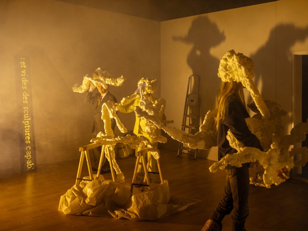 Chaque artiste en herbe s’affaire pour donner naissance à des compositions qui fourmillent d’idées et aussi de pitreries. La chaise suspendue en l’air par un crochet, intitulée la spectatrice émancipée, se voit recouverte d’une bâche en plastique, chaussée d’une paire de bottes et auréolée d’une épaisse fumée, la voilà renommée le kyste de ma mère, une fontaine de mousse envahit une partie de la scène comme une immense barbe à papa. Fantaisie et poésie se mélangent lorsque les sculptures en balatum ondulent doucement à l’annonce de la maitresse des lieux : « vous aussi, mes petites, vous irez à la biennale ». Pas de dialogues, de voix off mais un étrange sabir sert de langue commune.