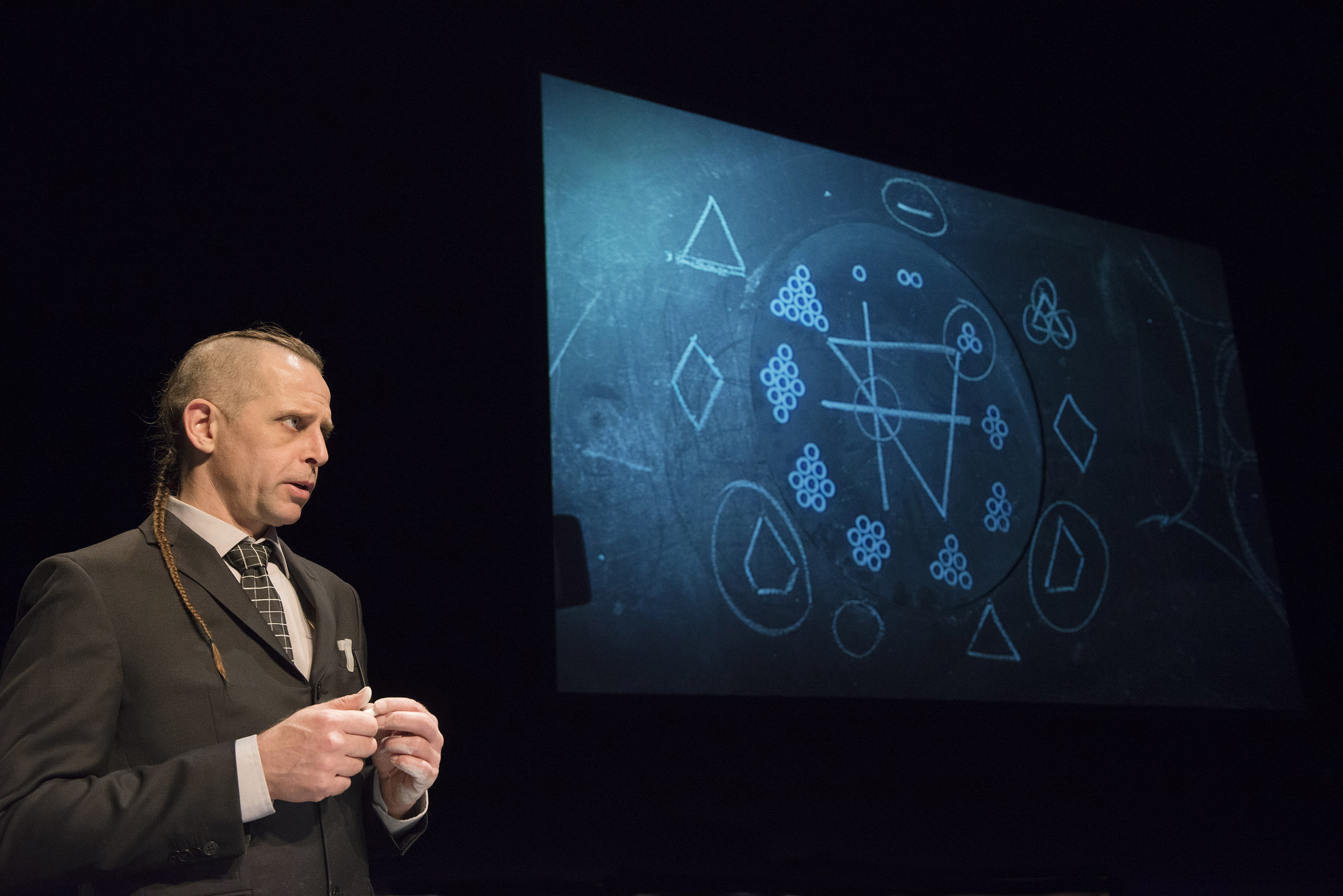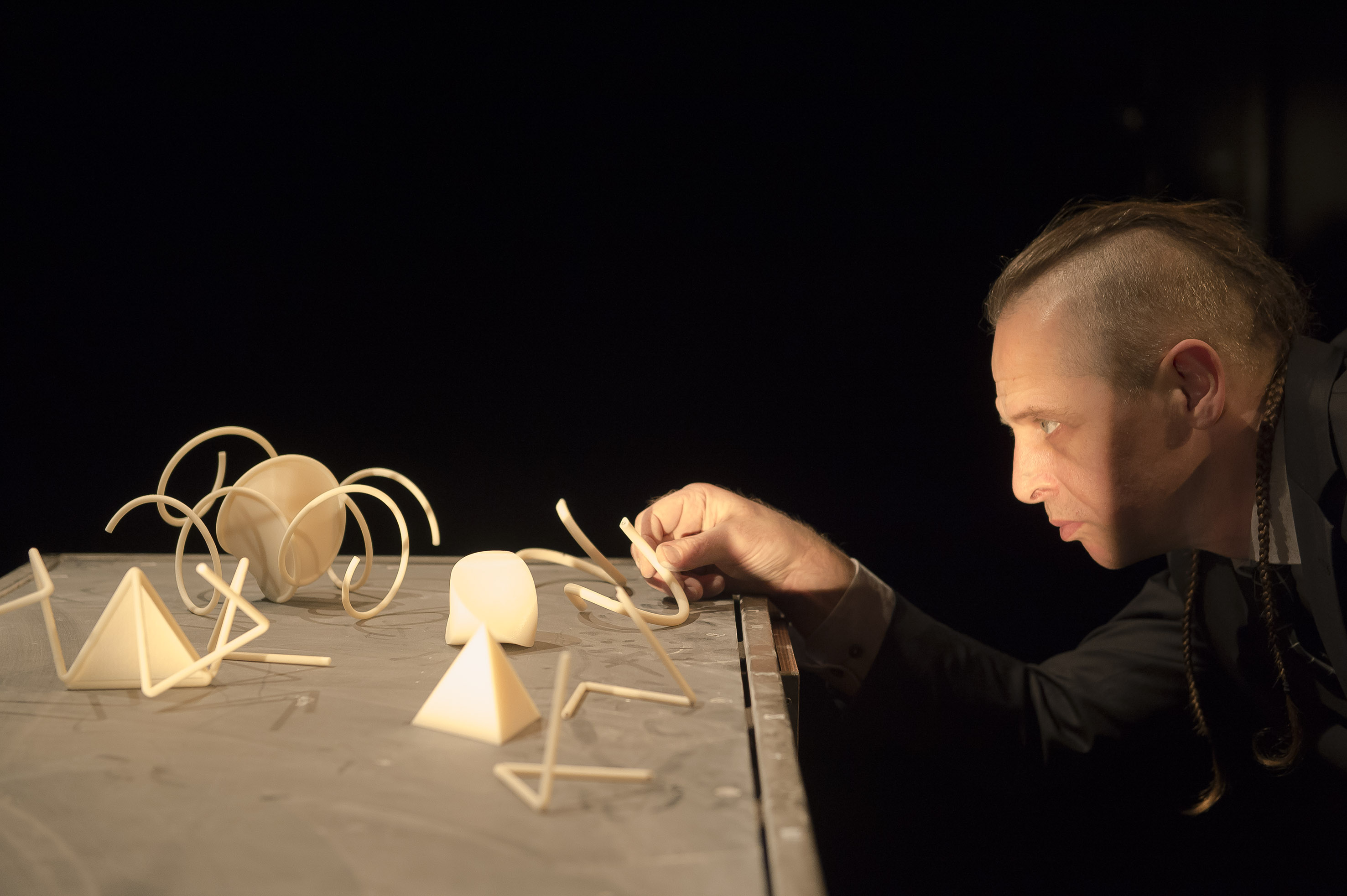 Johann Le Guillerm entre silencieux un instant avec une carriole à tiroirs dont il ne s’éloignera plus et dont le dessus sera la scène de ses démonstrations retransmises sur grand écran. Ce sera non pas une conférence théâtrale convenue mais un poème fait de discours et d’écritures inouïes, une heure trente organisée en « chantiers » arborescents. De son personnage de piste il ne reste que la coiffure, nattes et côtés du crane rasés. On découvre Johann Le Guillerm dans le costume gris et le ton d’un ponte universitaire, en équilibre entre un personnage clownesque et un discours en son nom propre, une voix douce et posée.