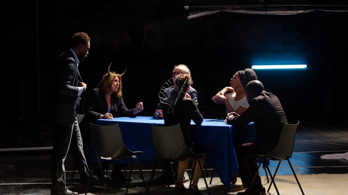 In medias res, les comédiens déjà engagés sur le plateau gesticulent, courent, assemblent ensemble – à la manière de l’écriture qui s’est faite au plateau dans un respect et une écoute de chacun – en une urgence, un plan, des lignes, une trajectoire, un chemin : celui de tous ces êtres devenus « migrants » à qui on a arrachés le statut et le droit d’être « Hommes », « Femmes ».