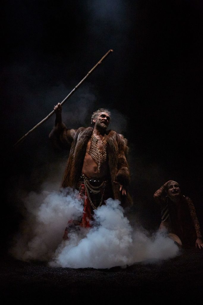 Mathieu Coblentz concentre la pièce autour des relations toxiques pères-enfants dans une scénographie de cabaret autour d’une passerelle en hauteur traversée par un castelet lumineux avec musique et numéros de cirque. Lumières changeantes, pénombre prégnante, les effets d’apparition-disparition nous saisissent ; la lande brumeuse en avant-scène est le lieu de la divagation et des métamorphoses, proche de nous comme au théâtre du Globe où se produisait Shakespeare. Le visuel soigné avec des costumes superbes mélange la fragilité de la soie aux textures solides et protectrices du cuir, de la peau, de la fourrure et de la grosse laine, évoquant les contrées celtiques dans lesquelles Shakespeare situe sa trame. Kilt et épée se marient au look baroque des rock star.