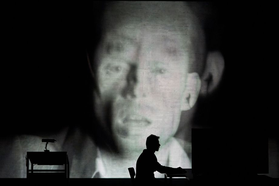 Pour Guy Cassiers, il s’agit là d’aller au plus profond de la langue et de décortiquer avec rigueur le discours fasciste que constitue les mémoires de Degrelle : la puissance du verbe, de la rhétorique, qui fit basculer l’Histoire. La forme débute sur un mode circonférentiel, gommant toute théâtralité, où un acteur vient, solennel, débuter une analyse scientifique du texte de Degrelle. La distance historique et scientifique permet un certain détachement. Mais ce qui est intéressant c’est que, peu à peu, un glissement s’opère dans le récit, les lignes se floutent et se diluent, et le comédien bascule alors du théoricien à Degrelle lui-même. Ce jeu de double identité est soutenu par le média de la vidéo en direct, mais également par un traitement tout à fait inédit de la voix, selon la technique du voice follower. Ces recherches contemporaines, entreprises avec le soutien de l’ICRAM (Institut de Recherche et Coordination Acoustique/Musique), permettent de jouer des identités multiples en modifiant le timbre du comédien, et en donnant à sa voix la saveur d’une époque oubliée.
