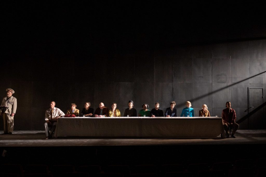 L’acte 2 est une vraie « apothéose » farcesque, parfaitement chorégraphiée. La parodie de la cène biblique dégénère dans la saoulerie générale à la santé des masses, truffée d’invectives contre la Révolution et d’aphorismes, comme « Ce qu’un vivant peut penser, seul un mort peut le dire », ponctuée par les « Quelle heure est-il ? » de Sermione. La direction d’acteurs, impeccable, restitue la puissance visuelle de Nicolaï Erdmann, rien de bavard chez lui, chaque phrase prête à des postures de jeu. On est au plus près d’une mécanique théâtrale qui rend le texte extrêmement moderne sur un rythme de cabaret. Les comédiens, excellents, se sont visiblement régalé à entrer dans le ballet macabre d’une société exsangue qui craque de partout. On se croirait sur le pont du Titanic un certain soir d’avril 1912.