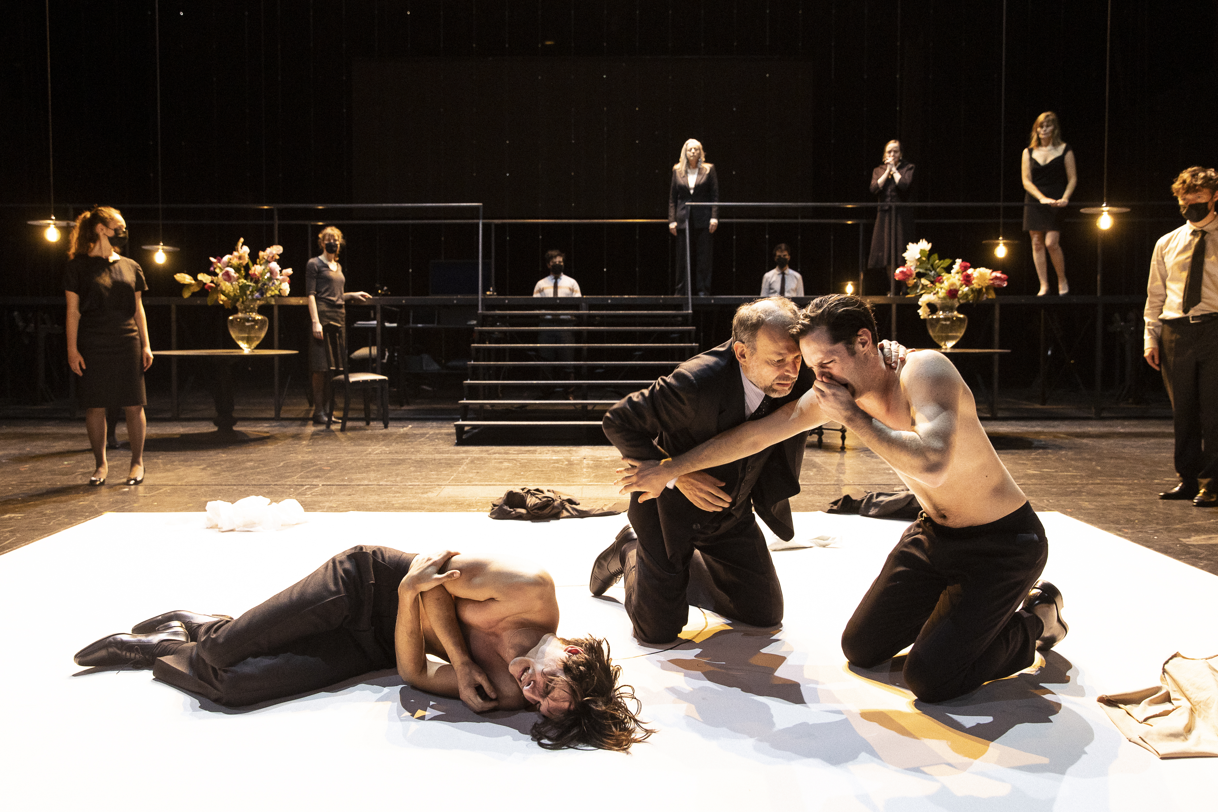 Ivo van Hove construit là, avec cette « première version » un univers évident. Tartuffe est trouvé sous des couvertures, mis à nu et lavé pour rejoindre la maison d’Orgon, cet homme riche et un peu naïf qui, suivant les conseils sombres et fort peu avisés de sa mère, va se faire avoir par cet homme. Sa famille lutte contre une emprise certaine, fait tout pour tenter, puis réussir de lui faire comprendre la réalité et ses douleurs, un peu tard certes.