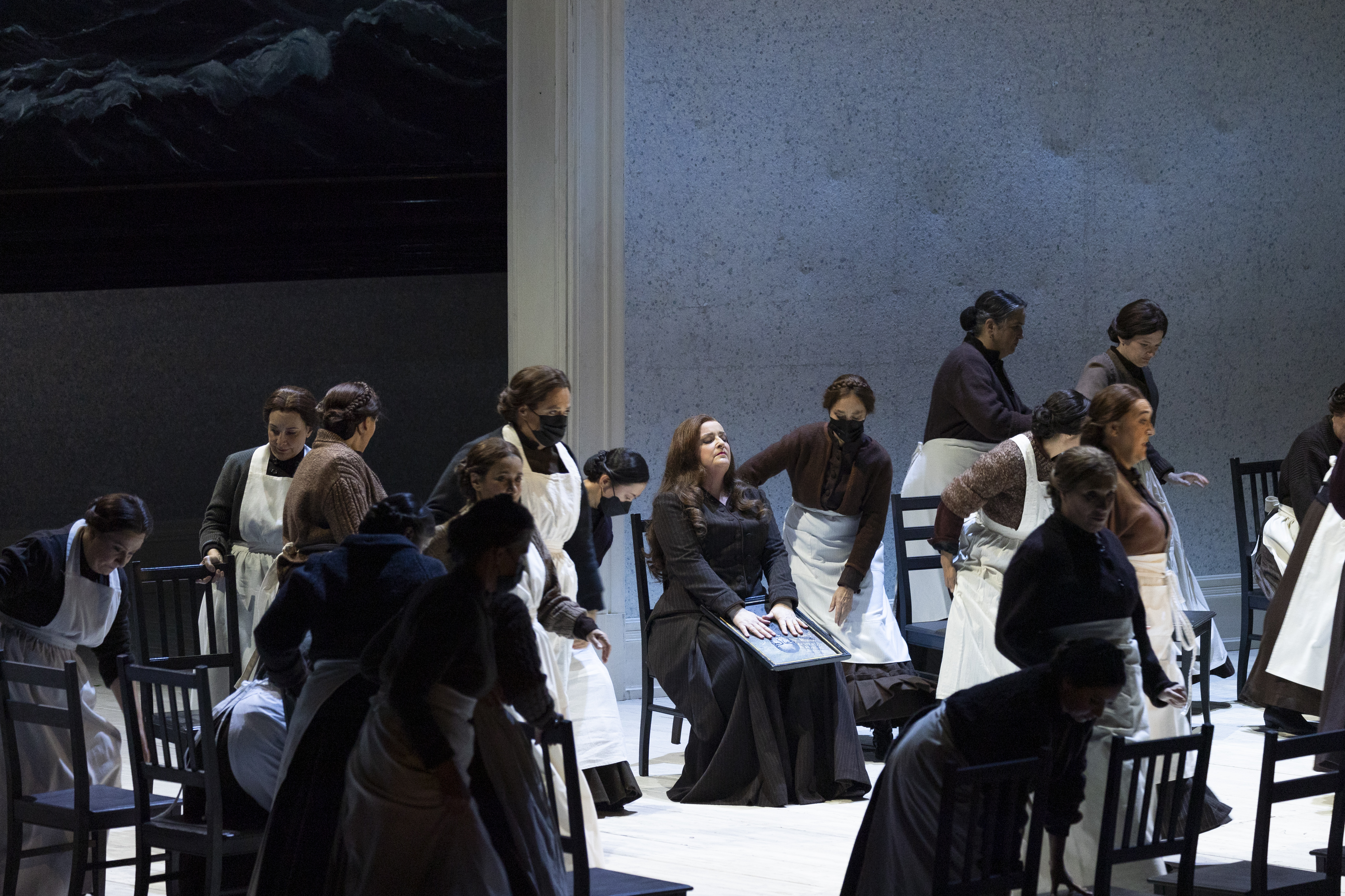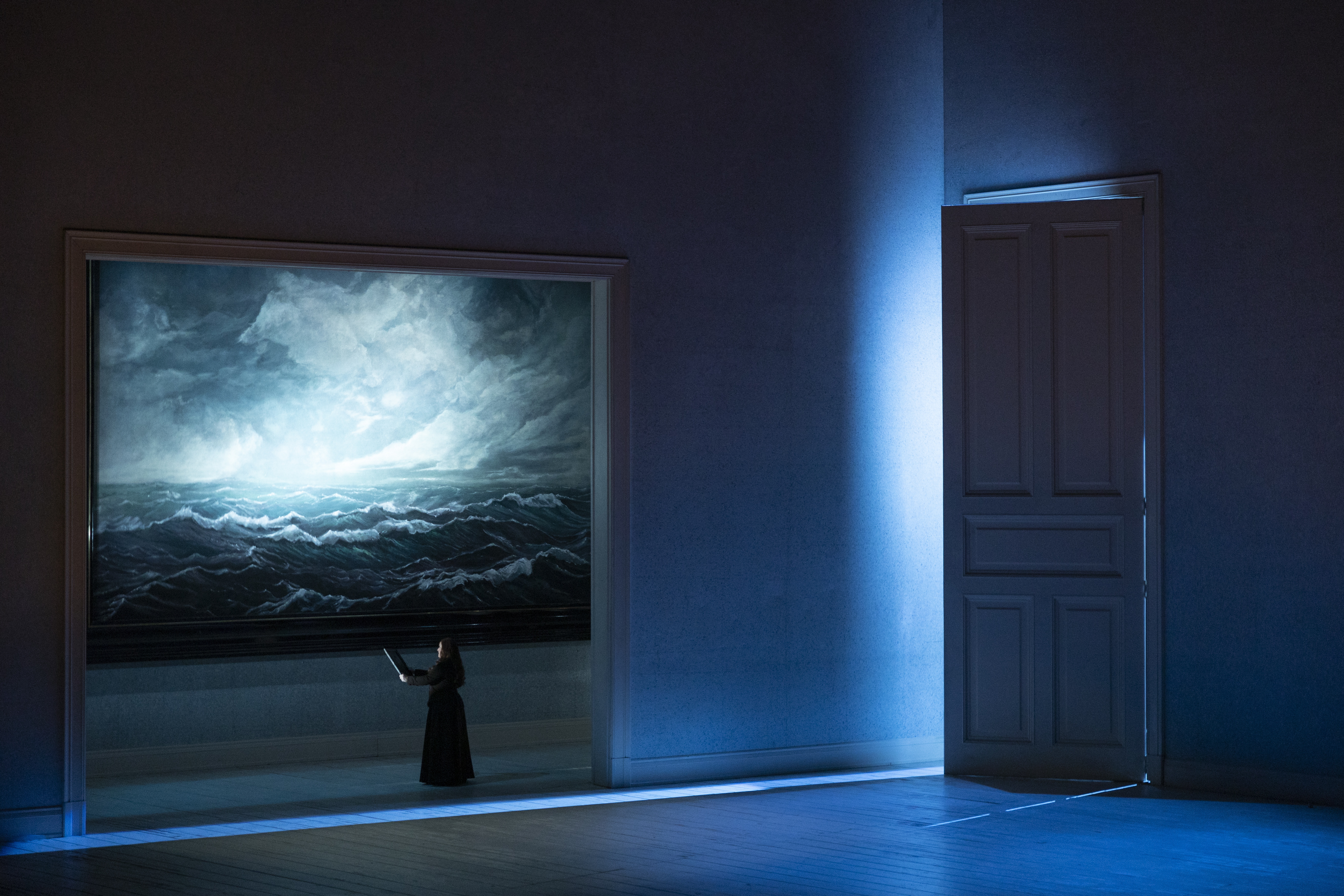 Cette mise en scène ne révolutionnera pas le genre. Classique, sobre et sans éclat vraiment. Willy Decker manque un peu d’audace sans doute bridé par ses intentions premières, une vision psychanalytique de cette œuvre. Quelques lourdeurs aussi dans les intentions qui voit par exemple miraculeusement et de façon peu vraisemblable un portrait, celui de Senta, surgir d’une poche comme par miracle et être présenté au Hollandais. Un plateau incliné, au lointain un gigantesque tableau, une marine où la mer semble déchaînée (sur laquelle en surimpression surgira le bateau du hollandais dépité et larguant les amarres), à jardin une porte et l’océan, la scénographie est certes efficace mais l’unité de lieu oblige à de certaines invraisemblance et limite même les intentions possibles tant il y a foule parfois dans cette pièce. Pas de bateau, pas de quai, sinon la symbolique de trois immenses cordages tirés par l’équipage de Daland de la porte au plateau. Cordes épaisses sur lesquelles s’appuiera le Hollandais, prisonnier de sa condition, l’image est là un peu télégraphiée. Plus tard, une voile rouge dans l’entrebâillement de la porte, pour le navire du Hollandais. Une direction d’acteur malheureusement un peu empesé que sauve heureusement le chant. Ricarda Merbeth est vocalement une Senta impressionnante, voix puissante et grande projection, belle expressivité, parfois un peu forcée, qui la voit sur la fin proche de la folie. Mais une théâtralité sans éclat, sèche, un jeu conventionnel et peu naturel, voire raide. Et comme pour Tosca qui depuis un certain temps ne se jette plus des remparts du château Saint-Ange, Senta ici se poignarde évitant la noyade… curieuse idée. Le baryton basse Tomasz Konieczny, Der Holländer, en impose par sa voix profonde et un jeu tout en retenu, sobre, mais une forte et magnétique présence. La basse Günther Groissböck de même, mais reste lui aussi dans un jeu conventionnel qui frise le cliché du genre. Michael Weinius, ténor, est parfait dans le rôle de l’amant éconduit Erick et offre à son personnage sacrifié une belle humanité. Et puis il y le pilote du ténor Thomas Atkins, sans doute la révélation de cet opéra. Rôle court mais qui laisse une très belle impression tant vocale que dans son jeu. Sans doute la révélation de cette production. Reste le chœur de l’Opéra de Paris, dirigé par Ching-Lien Wu de Paris qui offre encore une fois la mesure, parfois hors-mesure mais passons, de son talent et de son énergie. Le vrai capitaine de cette soirée, qui a sans doute maintenu à flot cette mise en scène, fut le chef Hannu Lintu. Sous sa baguette l’orchestre est tout à tour une mer démontée, un orage lâchant sa foudre. Il y a de la houle, du sac et du ressac, de belles accalmies aussi. C’est romantique et héroïque, du Wagner dans son ampleur comme on en rêve. Si cette mise en scène ne nous hantera pas plus que ça, la rédemption de cette production est bien venue de la fosse et, malgré quelques réserves, du casting vocal.