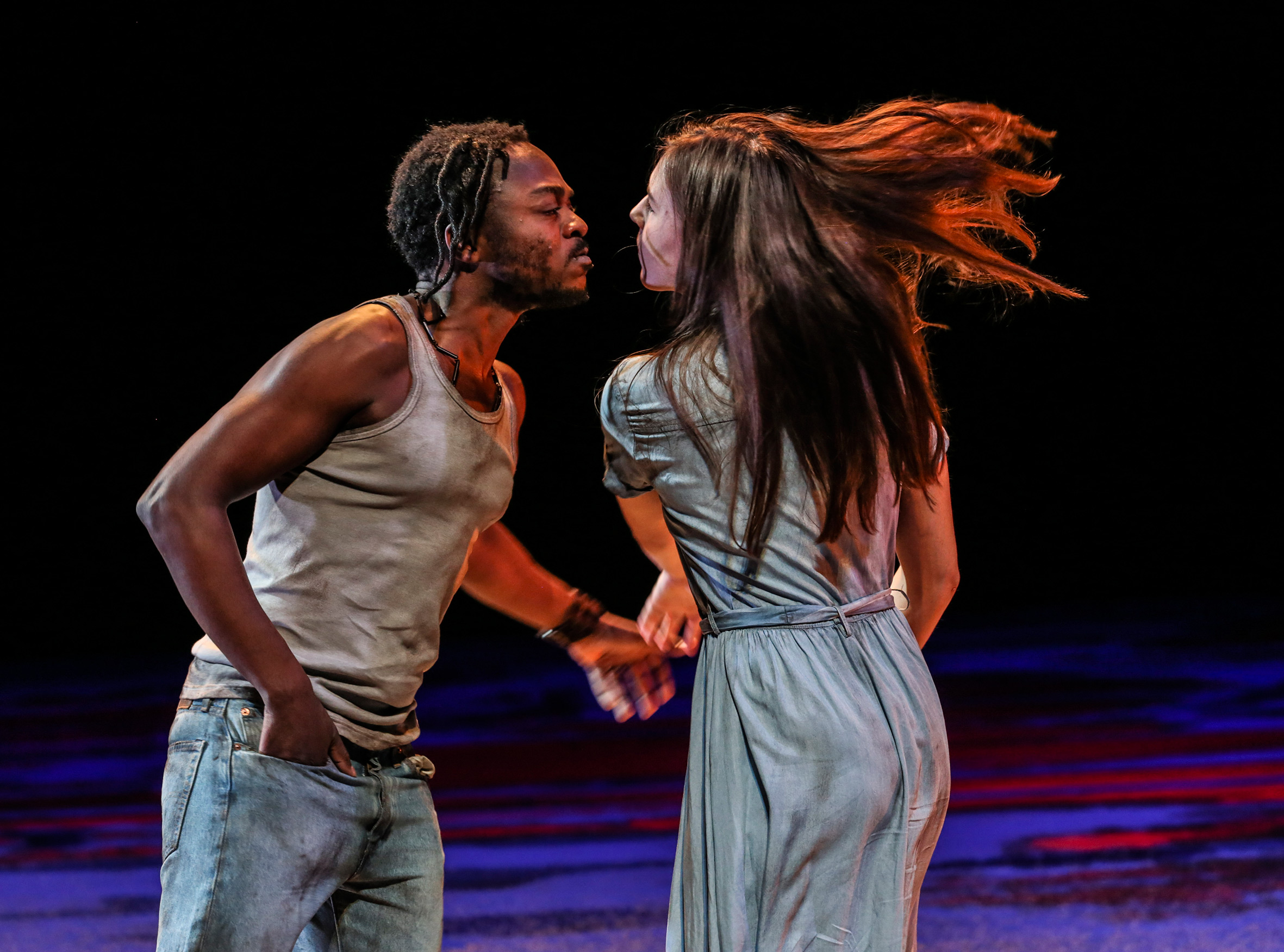 Rares sont ceux qui se frottent à l’écriture de Claudel aujourd’hui. Excessive, large et technique, elle demande une connaissance de son vers et un travail de précision, que Christian Schiaretti prend à bras le corps. Et il décide, en acceptant cette charge, de mettre la parole de l’auteur au centre du plateau. Une magnifique scénographie mystérieuse et déserte donne une lumière surnaturelle à cette plage où se croisent les couples. Mais le décor ne doit pas détourner l’attention du public. Par un jeu de texture, une ambiance particulière règne sur tout le plateau, mais l’espace de jeu réel, lui, est plutôt réduit. Si cela donne lieu à un enchaînement des scènes un peu monotones, où chacun rejoint sa chacune au centre pour sa scène avant de disparaître, cela provoque aussi de beaux moments d’intimité.