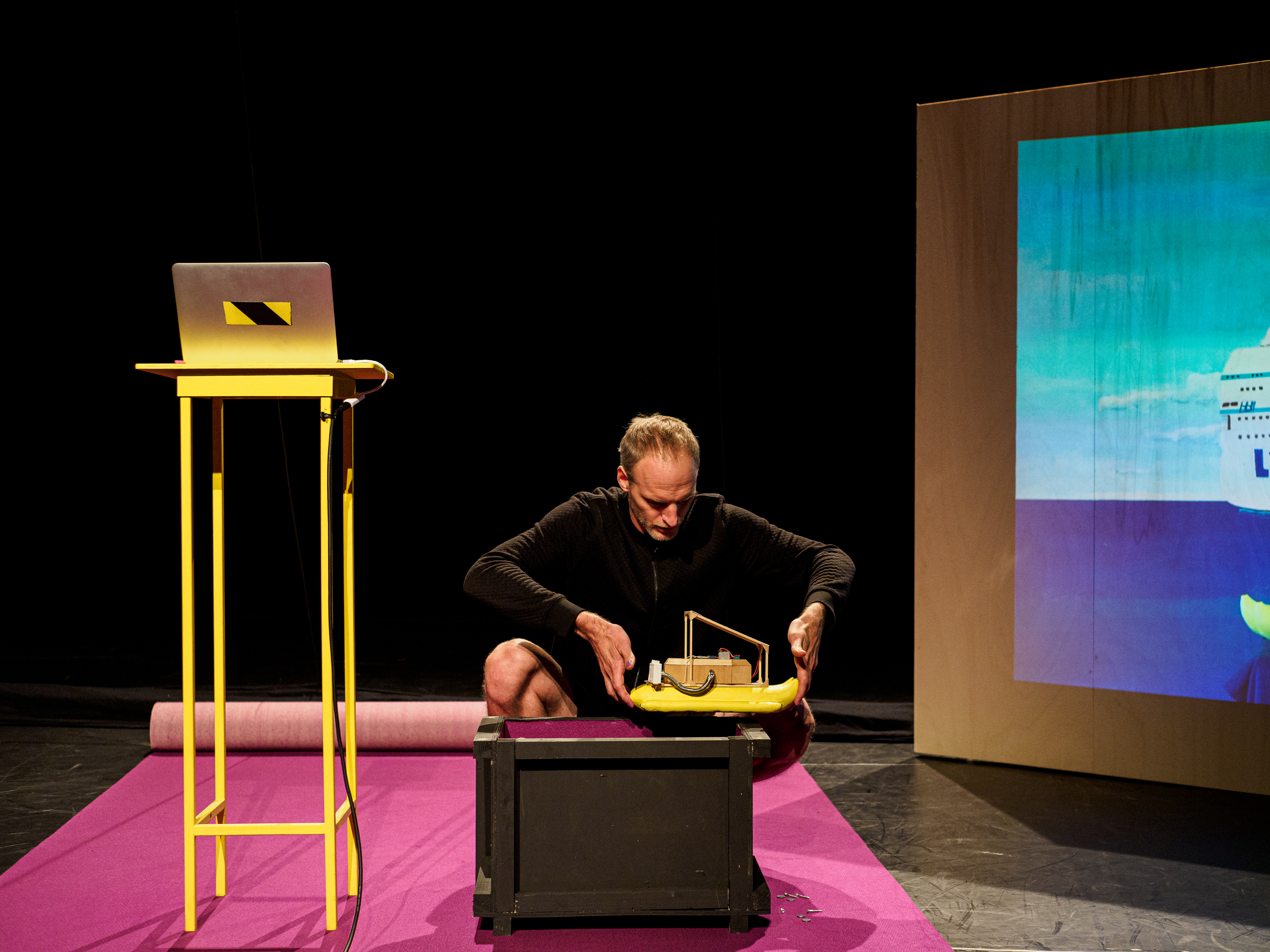 L’échappée ou la trajectoire improbable d’une œuvre d’art, un spectacle en « y » ou en i grec si l’on peut dire, de Philémon Vanorlé, un artiste belge chargé d’humour et tout autant charmé par la mort et ses alentours, est au sujet d’un cercueil avec, si l’on peut dire, des jambes. Oui, comme Philémon Vanorlé nous le demande dès le début, pourquoi un cercueil aurait toujours la même forme, et quel doit être l’ennui de nos jambes si elles ne s’entendent plus sous terre, imaginez-les confinées l’une contre l’autre, condamnées à se défairent sans se défaire…