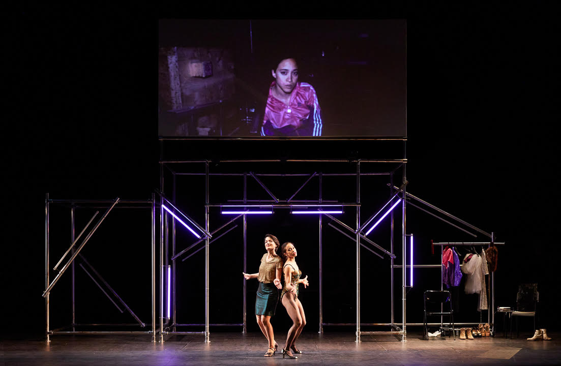 Rien à dire sur le chant et la musique. C’est fort bien chanté, l’orchestre de chambre Pelléas sonne à merveille. Seulement voilà, il manque à tout ça son poids de chair. Natalie Perez est une excellente chanteuse, mais manque singulièrement d’incarnation. La mise en scène ne l’aide en rien et trop souvent la plante là, sans façon, sans une véritable direction d’acteur, sans intention visible. Noémie Teelin danse, c’est parfait, la chorégraphie idem, mais là aussi il manque ce petit truc, ce pas de côté qui offrirait à son personnage là aussi une vraie dimension. Et pour le chœur des quatre garçons, la famille, si le chant est impeccable, Jacques Osinski l’escamote, le reléguant en arrière-plan, fond du plateau, diluant ainsi son emprise sur les jumelles. C’est une mise en scène volontairement dépouillée de son côté cabaret. Échafaudage d’acier et néon blafard, vidéo pour paysages urbains ou scène d’intérieur. Et c’est bien cela qui pêche. Tout y est trop lisse et sans relief, trop propre en somme. C’est de la belle ouvrage certes. Mais il manque ce que le cabaret apporte, la crasse sous le fard, l’âcre, le râpeux, l’ironie féroce, voire la distance caustique pour donner à cette œuvre satyrique tout son plein relief et son féroce mordant.
