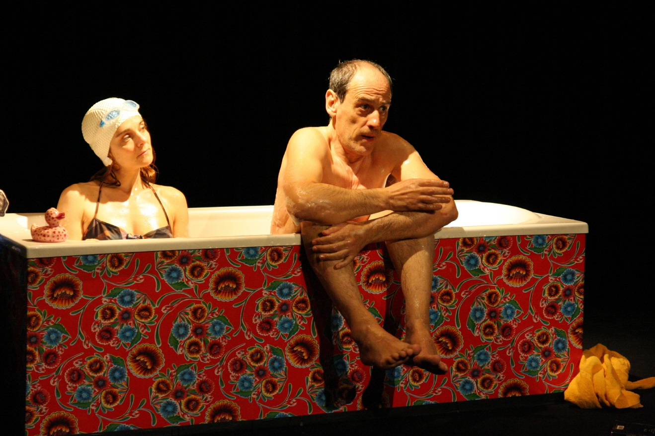 Deux comédiens, Isabelle Cagnat et Etienne Coquereau s’immergent dans une baignoire au milieu de leur salle-de-bain. Un toilette, un porte serviettes et une sortie de bain. Nous entrons dans l’intimité de ce couple. Peut-être trop d’ailleurs : certains spectateurs sont assis sur le plateau et profitent vraiment de la nudité du comédien, à pouvoir en palper.