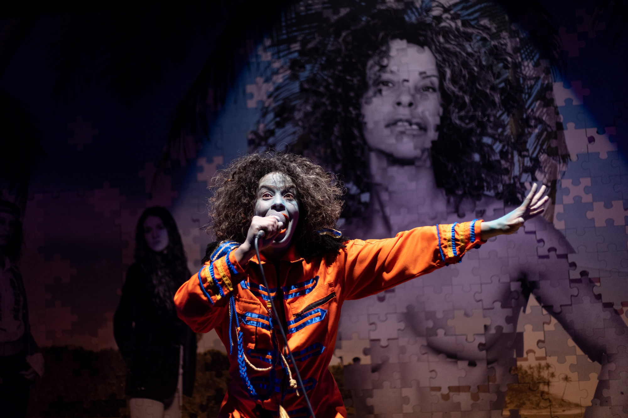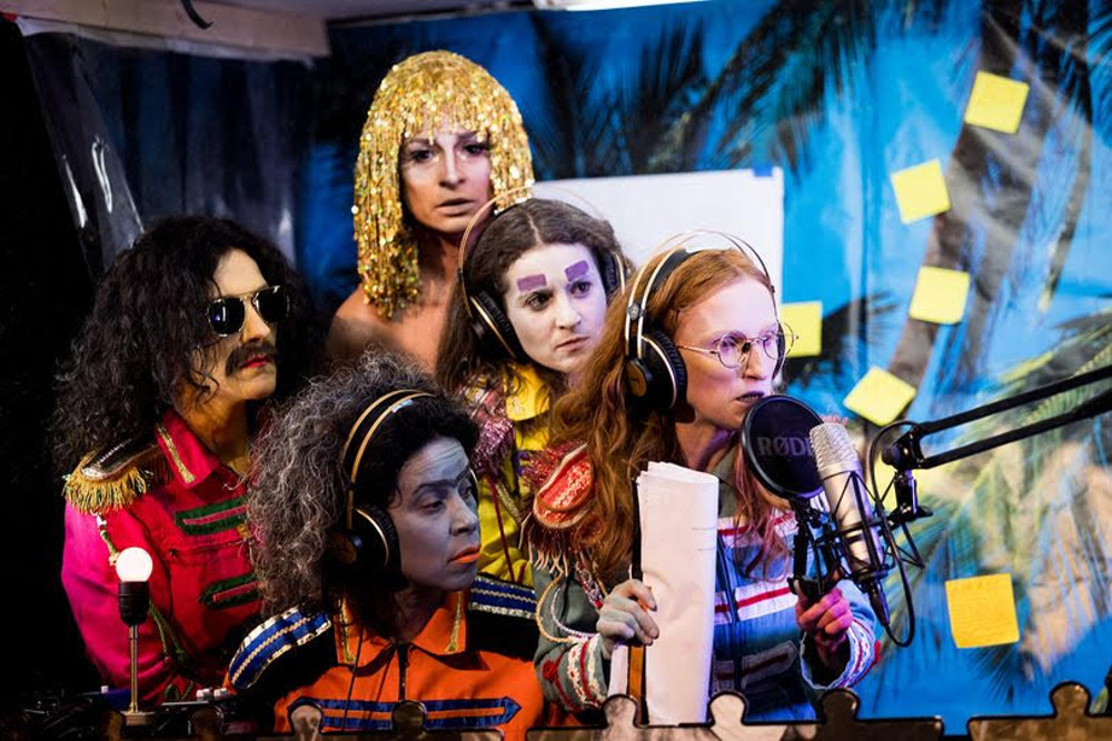 Ils sont cinq sur le plateau, les quatre apôtres évangélistes, clones improbables des Beatles période Sergent Pepper, et Marthe, enceinte jusqu’aux yeux. Boys-band réfugié après la mort de Jésus, leur leader, dans un studio d’enregistrement, une caverne, un tombeau où poussent sur les murs des champignons hallucinogènes consommés visiblement sans modération, ils rejouent leur tube, écrivent leurs évangiles sur des post-it, bricolent une radio clandestine, diffusent des poèmes publicitaires, des messages spirituels. Rêvent de sortir de là, d’échapper à leurs ombres. Dehors, la République et le Ku-Klux-Klan gouvernent le monde et piratent leurs messages.