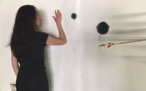 Au fond de la scène, trois grands panneaux blancs juxtaposés, des pigments noirs amassés à leur surface comme d’étranges touffes velues. La danse emprunte à la forme rituelle, elle est une préparation que l’on perçoit comme adressée à ces cibles. Le dos s’offre souvent aux regards, nous emporte avec lui vers un ailleurs, un au-delà, un en deçà, un envers : un inexprimable. La danse exécute ses combinaisons multiples et virtuoses comme la quête d’une clef secrète, et l’on repense ici à la parabole du chameau et de l’aiguille tant le but semble inaccessible et le désir tout autant inextinguible. Elodie Sicard décochera ses flèches, trouera les panneaux, les pigments s’animeront, pareils à une limaille de fer soumise à une invisible force magnétique, traçant leurs lignes imaginaires à la surface du visible. Dans la conscience du geste et sous le coup du regard affleure l’inconscient de l’être : Les aspirants poursuit l’épopée d’un Cy Twombly où la mythologie émerge, radieuse, d’une vision troublée. Tout au long de cette performance, d’autres références viennent encore à l’esprit, cinématographiques celles-là : Tarkovsky, dans son rapport à la folie, non pas envisagée comme une déviance à la trajectoire rectiligne, mais comme une qualité d’être et d‘affect ouvrant les portes d’une compréhension plus large. Dans cette exploration et extension du domaine du réel au-delà du rationnel, dans ces mouvements « magiques » de matière à la surface des panneaux, Les aspirants n’est pas en reste du Stalker où, dans la dernière scène du film, une enfant provoque le déplacement de verres à la surface d’une table par la seule intensité de son regard. Si le dispositif plastique d’Amélie Vignals travaille la profondeur de champ, en particulier imaginaire, et instille une troublante séduction dans son caractère insensé même, la création musicale de Jean-François Domingues travaille tout autant à cette dilatation du psychisme à l’œuvre dans cette pièce : notamment ces voix d’actrices italiennes, déformées, saturées, remixées, comme une matière diffuse et profuse, entêtante et irritante, convoquant collatéralement un parfum de cinéma pasolinien. Lorsque pour le dernier tableau, habillée d’une longue robe, Elodie Sicard se met à tourbillonner au son d’un Ay candela tonitruant, c’est au source du folklore que Les aspirants achève sa boucle, donnant à voir rétrospectivement ce parcours oraculaire comme une nouvelle et ensorcelante tarentelle.