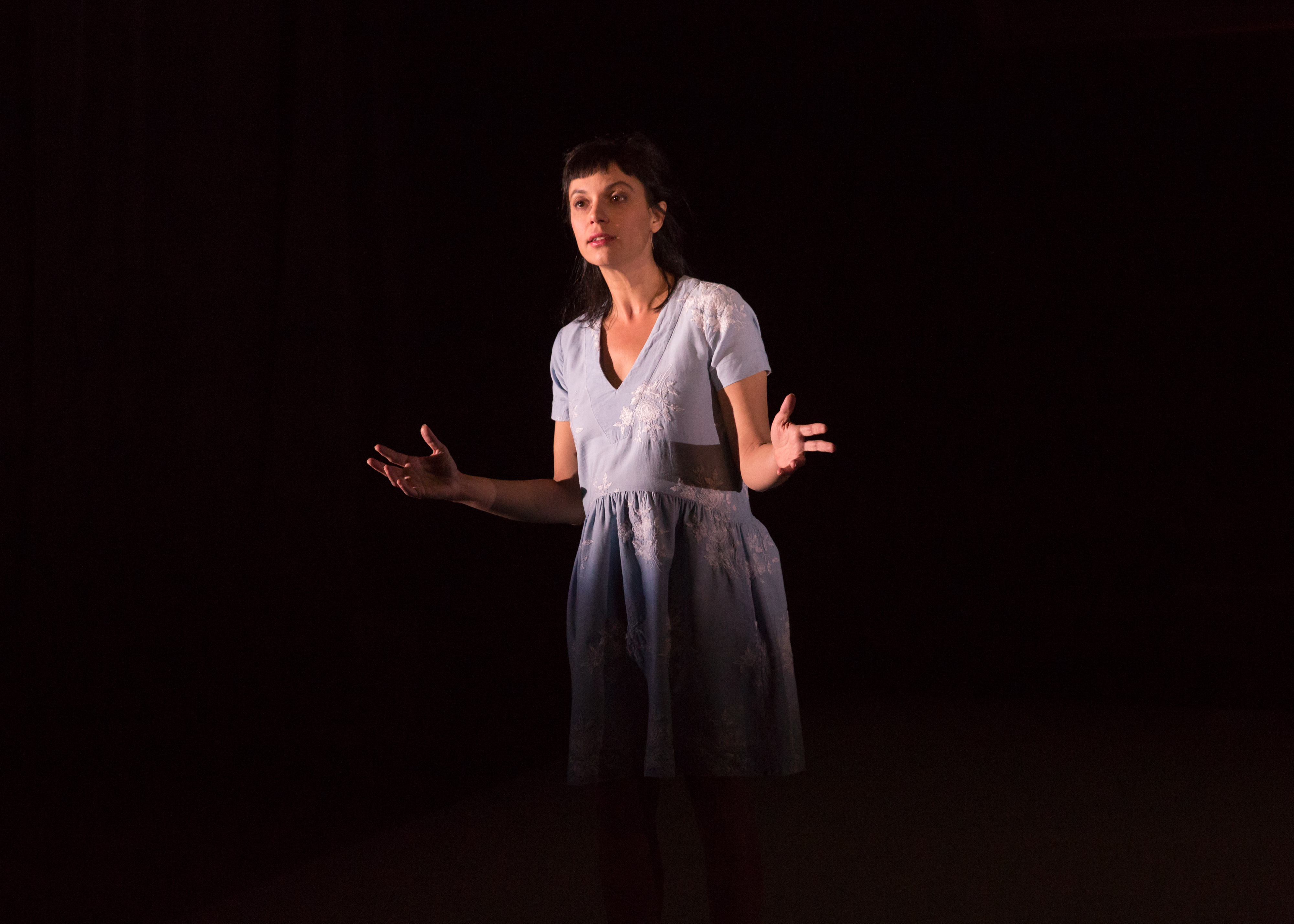 Oui, mais il y a peut-être plus essentiel, et plus retors. Nous voici vers la fin, la femme Céline a dépassé l’âge de ses parents, se réjouit de n’avoir pas peur de les perdre, de ne pas avoir à les tuer. Redoute tout de même « une malédiction qui se transmettrait de mère en fille ». Réfléchit avant de faire un enfant. Entonne a cappella Les yeux de ma mère, d’Arno. Remonte lentement sa robe. Ce n’est pas le corps de la fillette pépiante qui rêvait d’être danseuse. Ce n’est plus le corps de la jeune comédienne qui, à l’école de théâtre, rejouait les rôles de sa mère. C’est le corps d’une femme, et sur son ventre est dessiné un bébé. Déplacement de perspective, renversement d’émotion. Dramatiquement et visuellement, c’est superbe. Et là, oui, la boule dans la gorge. Il y aura cinq rappels.