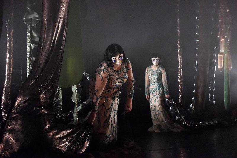 Pleurez mes yeux. Au milieu d’une clairière hantée, dans un décor de conte psychédélique et sous acide, trois créatures étranges aux yeux rendus immenses par le chagrin pleurent. Un chagrin qui semblent ne pas avoir de fin… Quand survient un braconnier, enfin c’est ce qui est écrit dans le dossier de presse, maître de ces lieux probablement, on ne sait pas trop à vrai dire, pour une partie de cache-cache cauchemardesque… Bientôt surgit de nulle part un serial-killer, semble-t-il, poète avant tout. Il y aura des danses échevelées, des chansons bramées, un poème en boucle récité. Et pour conclure, tenter de donner la clef de tout ce bazar métaphysique, une gueule dentue, mâchoire de T-Rex sans rien autour… Voilà, résumé comme ça, ça peut paraître étrange et barré. Ça l’est. Au sortir de cette création décalée voire loufoque, le propre de la Compagnie du Zerep, on reste un peu perplexe. À se demander sans trouver la réponse si c’est de l’art ou du cochon. Certain crieront au génie, d’autre resteront de marbre. Conte cruel ou farce candide, c’est totalement décousu, en apparence, sans queue ni tête comme tout cauchemar. On saute ainsi du coq à l’âne, de propositions en propositions, désaccordées, sans réel lien vraiment sinon le thème ténu et fragile de la douleur de vivre, croit-on comprendre. Opérette dramatique est-il écrit sur la feuille de salle. Peut-être. Ajoutons dada pour cette façon unique de faire fi de toutes contraintes, d’user comme à leur habitude de toutes formes d’expression et d’en faire sinon la synthèse du moins d’opérer des accordailles plus ou moins heureuses… et de faire exploser le tout. Si la première image est intrigante et franchement superbe par son étrangeté et sa beauté, promesse et ouverture vers un monde onirique propre au conte, très vite l’envie d’en découdre et de démantibuler cette première impression, de ne pas s’y installer, prend le pas et laisse place à une pantalonnade où le grotesque le dispute au trivial, contrepied cauchemardesque absolu et jubilatoire de ce à quoi nous aurions aimé prétendre. Fausse promesse tenue donc. Mais dans ce marasme organisé de main de maître, avec talent certes, on perd très vite pied, l’intérêt s’émousse et on cherche en vain à quoi tout cela rime. Fumisterie ? Et si cela ne rimait à rien ? Là, dindon d’une farce retorse que nous serions, ça confinerait au génie…