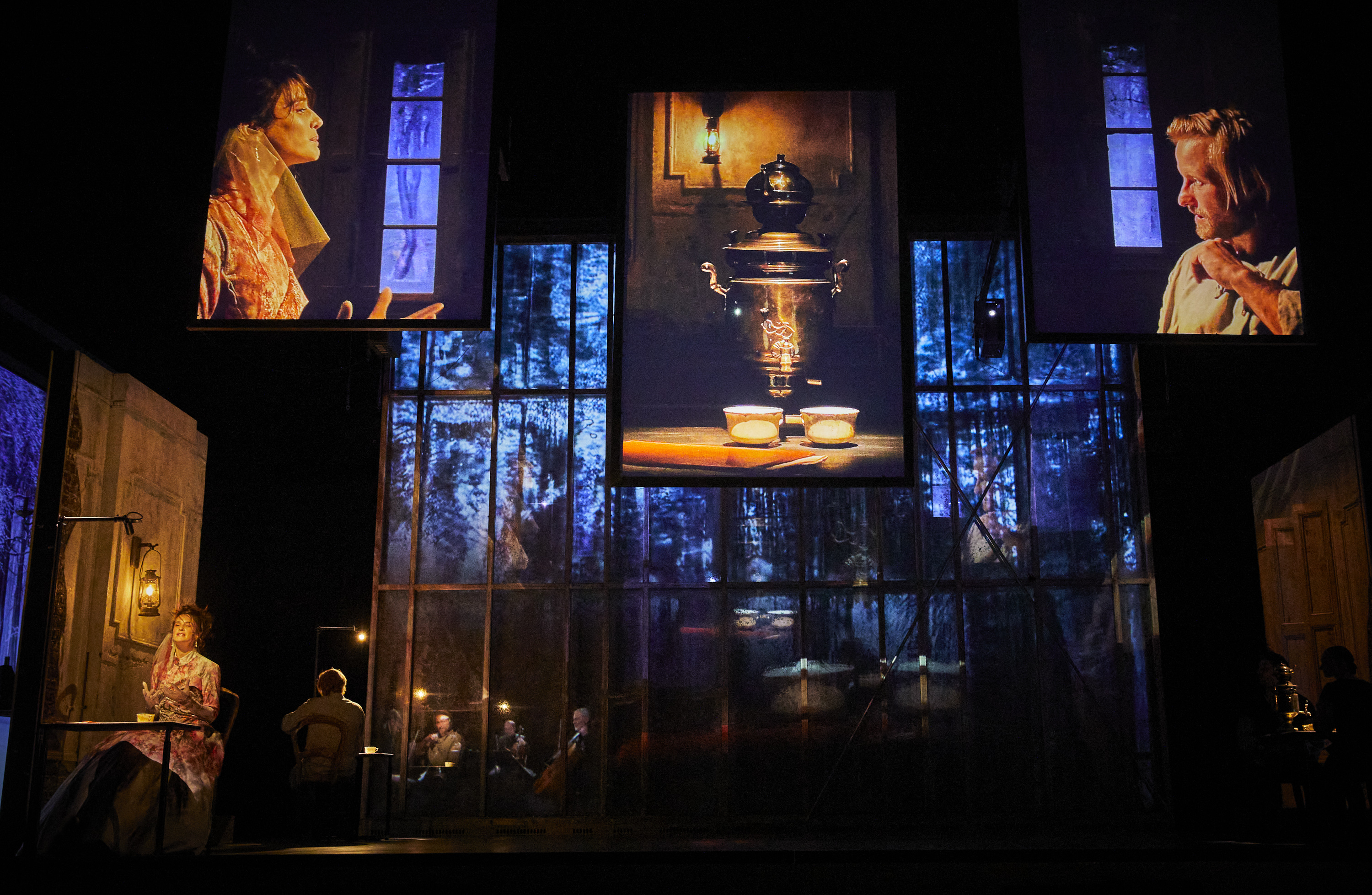 La – les – surprise(s) naissent et la scénographie doit rire en nous voyant. Les personnages discutent, échangent, se touchent. Oui et alors ? Eh bien le face à face n’existe pas, il est recréé plutôt. Varvara (elle aime tout diriger) apprend à Stépane qu’il va épouser Dacha. Ils sont chacun d’un côté de la scène, se tournent le dos, et apparaissent sur trois écrans gigantesques et suspendus, trois miroirs presque. Dominique Blanc et Hervé Pierre sont face à des « aides » qui prêtent leurs mains, avant-bras, pour que les reflets soient justes, fassent « comme si » ils étaient côte à côte. Les spectateurs peuvent regarder les comédien-nes, souvent de dos, loin, isolés, les reflets géants font « justice, justesse ». Au tout début cela fait perdre un rien l’attention au texte, l’admiration amusée l’emporte. Et puis on décide ce que l’on veut suivre, film lié ou théâtre découpé. On passe de l’un à l’autre. Toute la première partie de la pièce est ainsi. Comme par magie, magie obscure certes. Personne ne cherche à aller vers l’autre. Cette idée a du bon et du moins bon, l’étonnement émerveillé se lasse. Et sur ces visages surdimensionnés les micros apparaissent, avec ce petit scotch qui les maintient, etc. Les voix y sont aussi comme ligotées, loin, un rien cotonneuse, du début à la fin. Dommage.