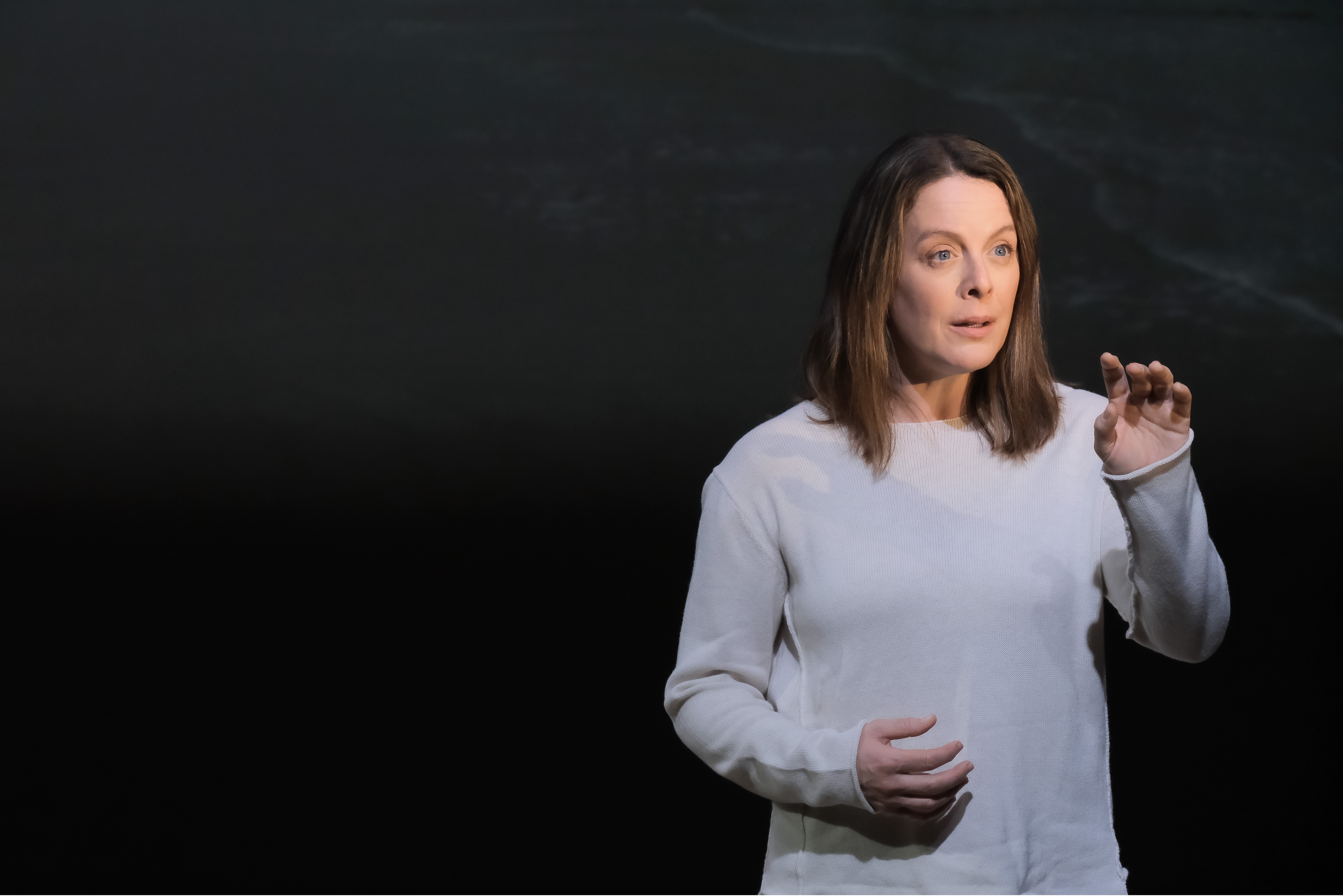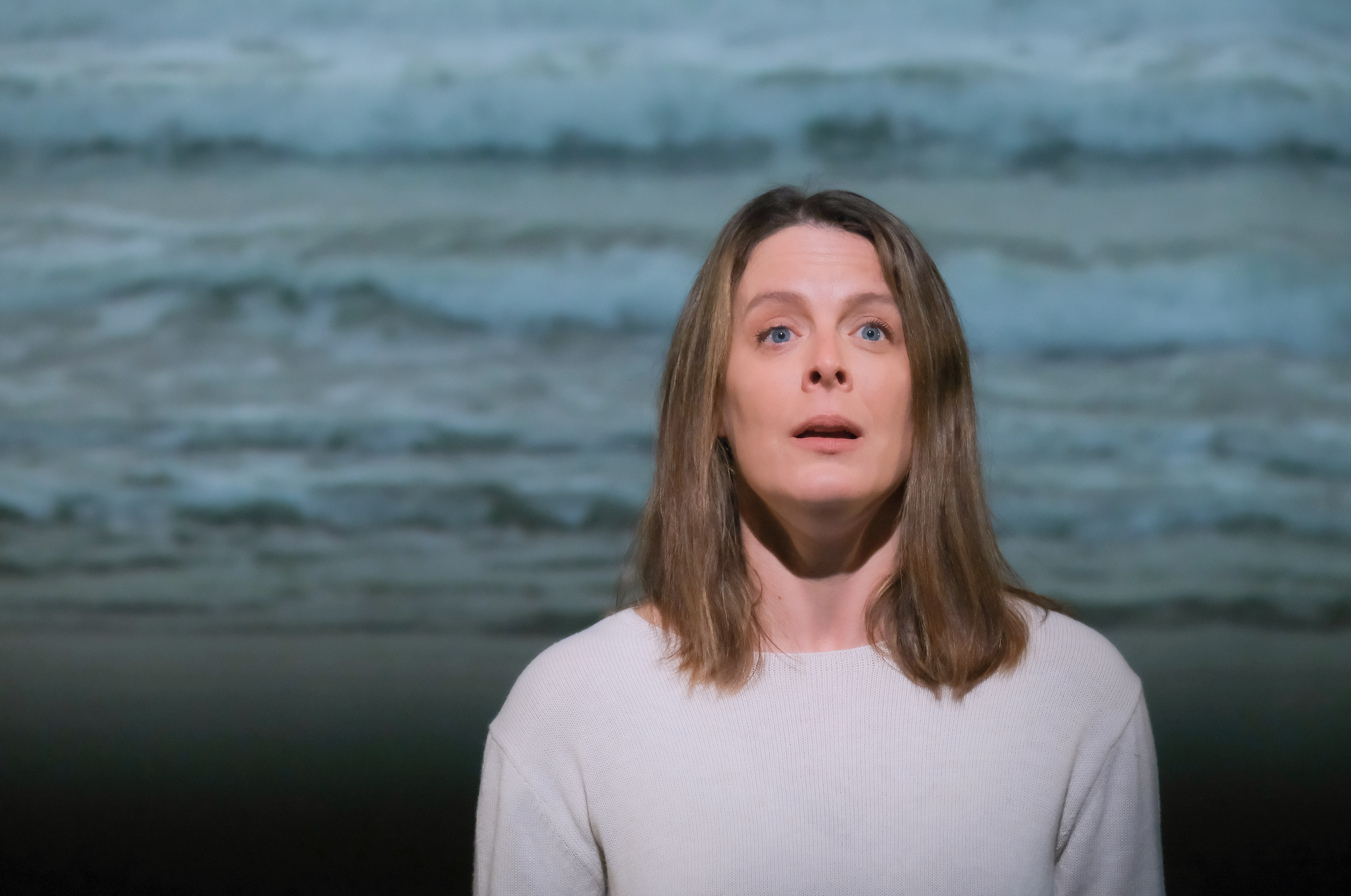 D’emblée, trois écrans blancs se lèvent autour de la scène, comme des voiles. S’y projettent les images d’une mer cinémascopée. Au centre, une femme (Julie Le Breton) assise devant un rocher feuilleté : les strates d’une vie prête à se dévoiler.
