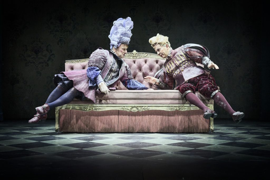 Si la direction d’acteur est ainsi au cordeau, comme toujours avec Emma Dante, surgissent d’autres idées de la plus belle eau, inattendues. Les costumes ont une extravagance pop, les perruques se font meringue, les livres sont des jardin que l’on arrose, les tapisseries se couvrent de fleurs en bouquet. Les canapés, symbole bourgeois par excellence, mobiles, avalent ou recrachent les personnages. Et la maison se referme lentement sur elle-même, enclos les personnages dans un espace de plus en plus étroit jusqu’à la résolution de la crise qui les voit être entassés dans un joyeux brouhaha sans avoir conscience de cet enfermement. Rien donc ne semble résolu qui se perpétue conclue Emma Dante. Laquelle n’oublie jamais la théâtralité qu’elle dénonce volontairement par la poésie et l’artifice. Et puis les comédiens du Français ont ce génie ici de ne pas craindre le ridicule mais de lui apporter une étincelle d’humanité.