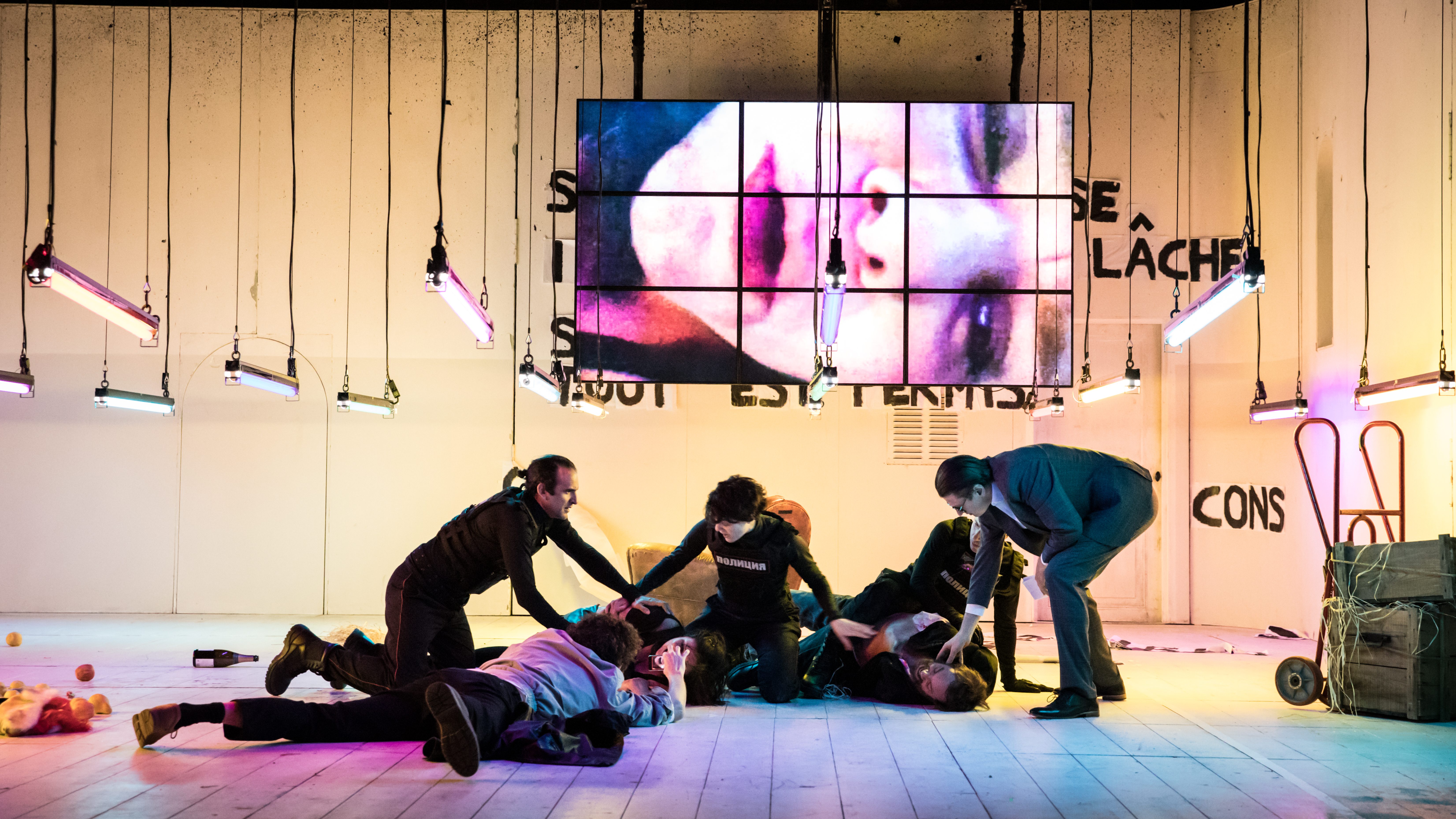 Adapter, traduire c’est toujours trahir. Pour le meilleur comme pour le pire. Là, nous avons le meilleur. Des 13OO pages et quelques du roman de Dostoïevski, Sylvain Creuzevault taille à la hache pour une version épurée en apparence, en apparence seulement, autour d’une seule question, qui des trois fils a tué le père, Fiedor Karamazov. Si Dieu n’existe pas tout est permis est-il graphé sur le mur du plateau quasi nu, réduit à l’essentiel. L’impression fugace d’une salle d’autopsie où bientôt sera disséqué le cadavre de la Russie exsangue dont cette famille dysfonctionnelle est le symptôme. C’est d’ailleurs là que sera exposé, dans une scène d’anthologie, le corps puant la charogne du Starets Zossima. Plus qu’une enquête policière sur ce parricide, c’est avant tout la quête existentialiste, métaphysique et politique de chacun parcourant cette œuvre monstre qui est ici mis en exergue, résumé de façon lapidaire et explosive tant elle est ici concentrée à l’extrême en trois heures de temps. Le rapport à la foi, l’affrontement entre le bien et le mal, la culpabilité, la rédemption, la justice, le politique et le religieux, c’est un vaste jeu de massacre auquel excelle Sylvain Creuzevault qui prend au pied de la lettre l’injonction de Jean Genet pour qui ce roman est « une farce, une bouffonnerie vaste et mesquine. » Et l’œuvre transposée dans la Russie de Poutine ne manque du coup pas de sel… et de pertinence. Et au jeu de citations, si pour Müller « qui crée veut la destruction » le metteur en scène allègrement retrousse ses manches et se met à la tâche sans barguigner. Il pilonne certes l’ouvrage mais pour mettre à jour ses fondations. C’est proprement jubilatoire et corrosif et limite borderline. Mais ça, le borderline, Sylvain Creuzevault sait y faire et avec maestria. Avec doigté cependant, restant toujours dans les bornes du texte à qui il insuffle une modernité radicale et âpre. Avec une économie de moyen drastique, il ne s’embarrasse de rien, expédie au besoin le superflu, qui laisse toute la place aux acteurs qui empoignent leurs personnages avec une conviction fortement chevillée et un naturel confondant donnant corps au réel à chacun de leur personnage incarné. L’impression d’une improvisation permanente, où Nicolas Bouchaud décidemment se surpasse avec une maîtrise stupéfiante. Mais il faut souligner l’ensemble et la cohérence de cette troupe, on peut parler de troupe ici, dirigée au cordeau et ne rechignant pas à la tâche pour défendre avec ardeur et une bonne dose de folie cette vaste blague, cette géniale bouffonnerie. Le rire est une déflagration libératoire mais c’est toute la lucidité et l’ironie métaphysique, on peut dire ça, de Dostoïevski qui nous explose salement à la figure.