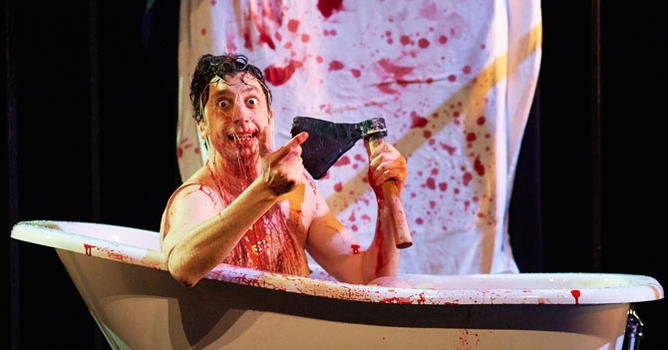 Sanglant ! Gilles Ostrowsky, nouvel oracle, nous conte à sa façon les Atrides, famille maudite des dieux, et ça saigne…Les Atrides, on connait. Mais sous cet angle là, ça devient une farce énorme et décapante. La vengeance est un plat qui se mange d’abord chaud. Ça commence, quoi de plus normal, par une sale boucherie, une recette de marmousets découpés, hachés, servis en ragoût par Atrée au propre père de ces malheureux enfants, Thyeste, lequel avait couché avec sa belle-sœur, ce qui, en principe, ne se fait pas… Ça se poursuit, recommandation divine qu’on ne discute pas, par un viol incestueux pour une vengeance tardive. Plus tard, donc, quelques meurtres bien gores pour respecter le contrat. Puis le sacrifice, au grand désespoir de sa mère Clytemnestre, d’Iphigénie pour du vent (ça, c’est pour la blague). La guerre de Troie. La noyade vengeresse suivie d’une décapitation sauvage d’Agamemnon par une Clytemnestre en fureur. Le matricide d’Oreste pour réponse, la folie de celui-ci et son suicide pour conclure…N’en jetons plus les enfers sont plein ! Gilles Ostrowsky est en fureur, les sangs lui tournent et ce qu’il raconte est à frémir…de rire. En short rose, tongues, et chemise hawaïenne, mais avec un casque grec quand même, notre clown mis en scène par Jean-Michel Rabeux, un spécialiste du gore frais, n’hésite pas à endosser tous les rôles, du mouton bientôt sacrifié à Clytemnestre, superbe travelo chancelant en robe lamé et talons hauts. Aux grands maux les grands remèdes, il est imbattable dans le maniement de la hache et de l’épée. Ca tranche sec. Ca gicle beaucoup. Cette vendetta sanglante et mythologique est narrée avec une énergie, une conviction, une drôlerie à faire peur. Gilles Ostrowsky est possédé comme la pythie de Delphes, comme Cassandre bavant ses petites belettes. Si fou par ailleurs que prudemment Jean-Michel Rabeux, du moins au début, l’encage. C’est un fauve Gilles Ostrowsky. Un drôle d’animal que Jean-Michel Rabeux met en scène avec ironie, intelligence et liberté. Jouant de l’horreur et de la terreur pour mieux en rire. C’est l’Orestie au théâtre du Grand-Guignol !