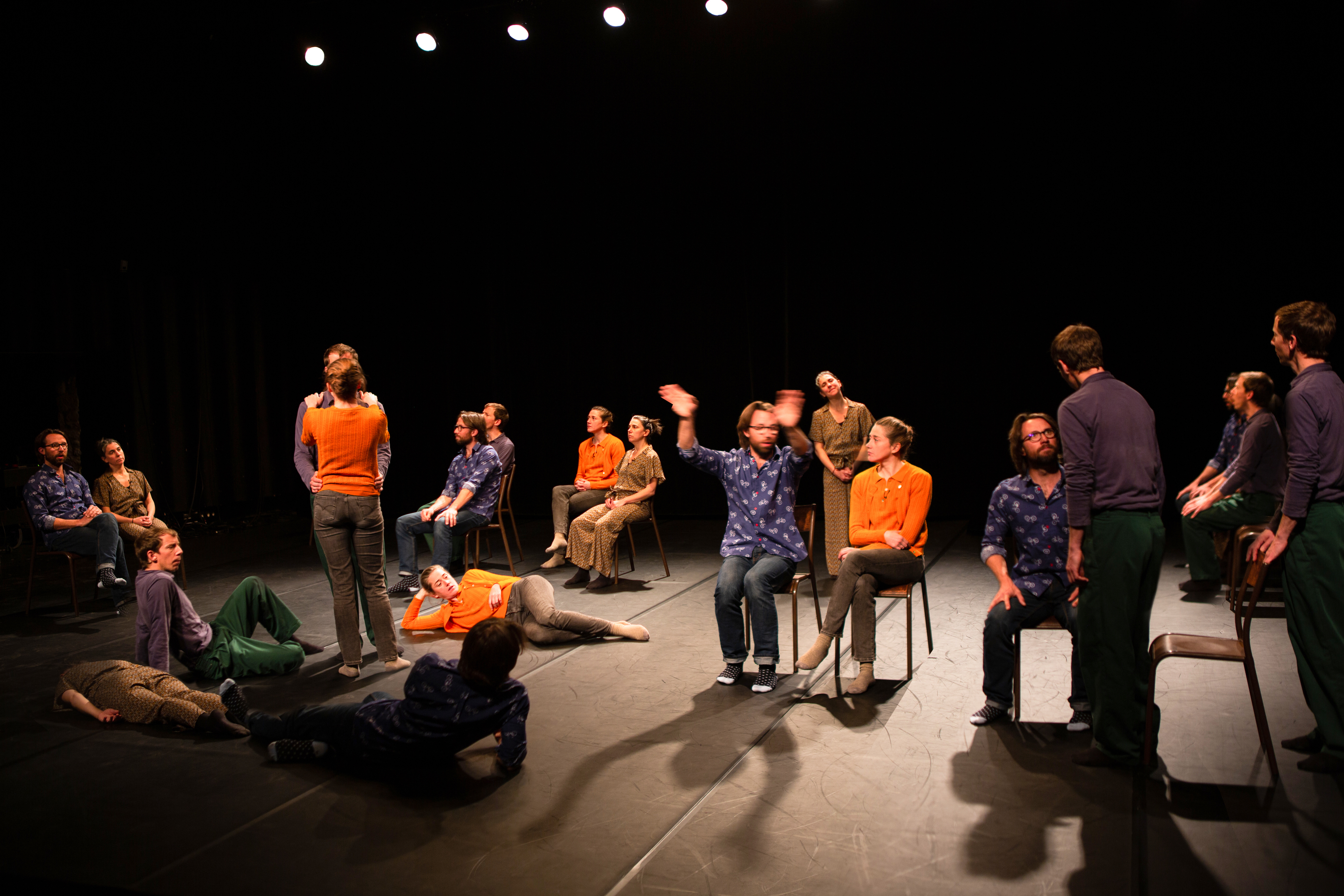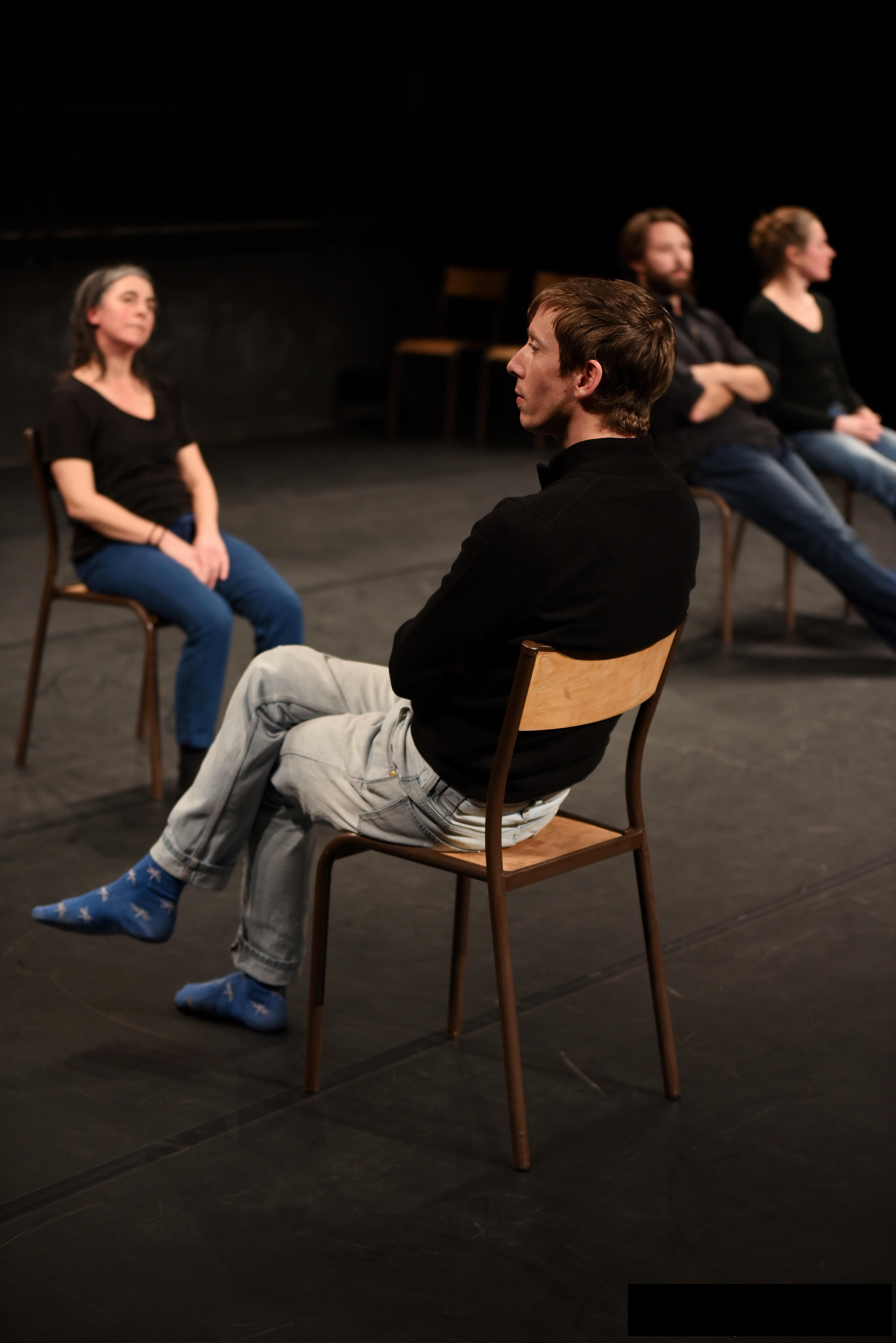 Constitué de presque rien, Les Galets… embrasse le tout de la communauté humaine. Quelques chaises d’école et quatre interprètes (Julien Athonady, Nicolas Chaigneau, Claire Laureau, Marie Rual) suffisent à faire exister cette sorte de bréviaire, à la Bouvard et Pécuchet, de la Comédie humaine. A quatre, il est possible de se partitionner, à deux contre deux, ou trois contre un, ou de se rassembler en un tout, toujours instable. Si Les Galets… développe sa matière textuelle, à la manière de banales conversations très réalistes, et fait ressortir ces travers qui nous font sourire, et souvent rire, à la manière des Caractères de La Bruyère, l’attention, ou mieux dit : l’intention, s’inscrit dans les corps en présence. La singulière petite musique de chambre orchestrée par ces interprètes virtuoses prend la physicalité d’un corps, étrange, se mouvant, entre pulsions, et répulsions, façonné par ce cortège d’êtres papotant. Et si l’on pense à Christoph Marthaler, ce n’est pas seulement pour ces chants en chœurs, pour Bach (Que ma joie demeure !), mais parce que fondamentalement il y a du corps dans la musique des voix, et de la musique dans la danse silencieuse des corps immobiles, ou si peu mobiles. Il y a enfin des présences magnifiques, d’une finesse troublante, quand pourtant tout est écrit au cordeau, au souffle près, et que pourtant tout palpite, et crépite du premier feu.
