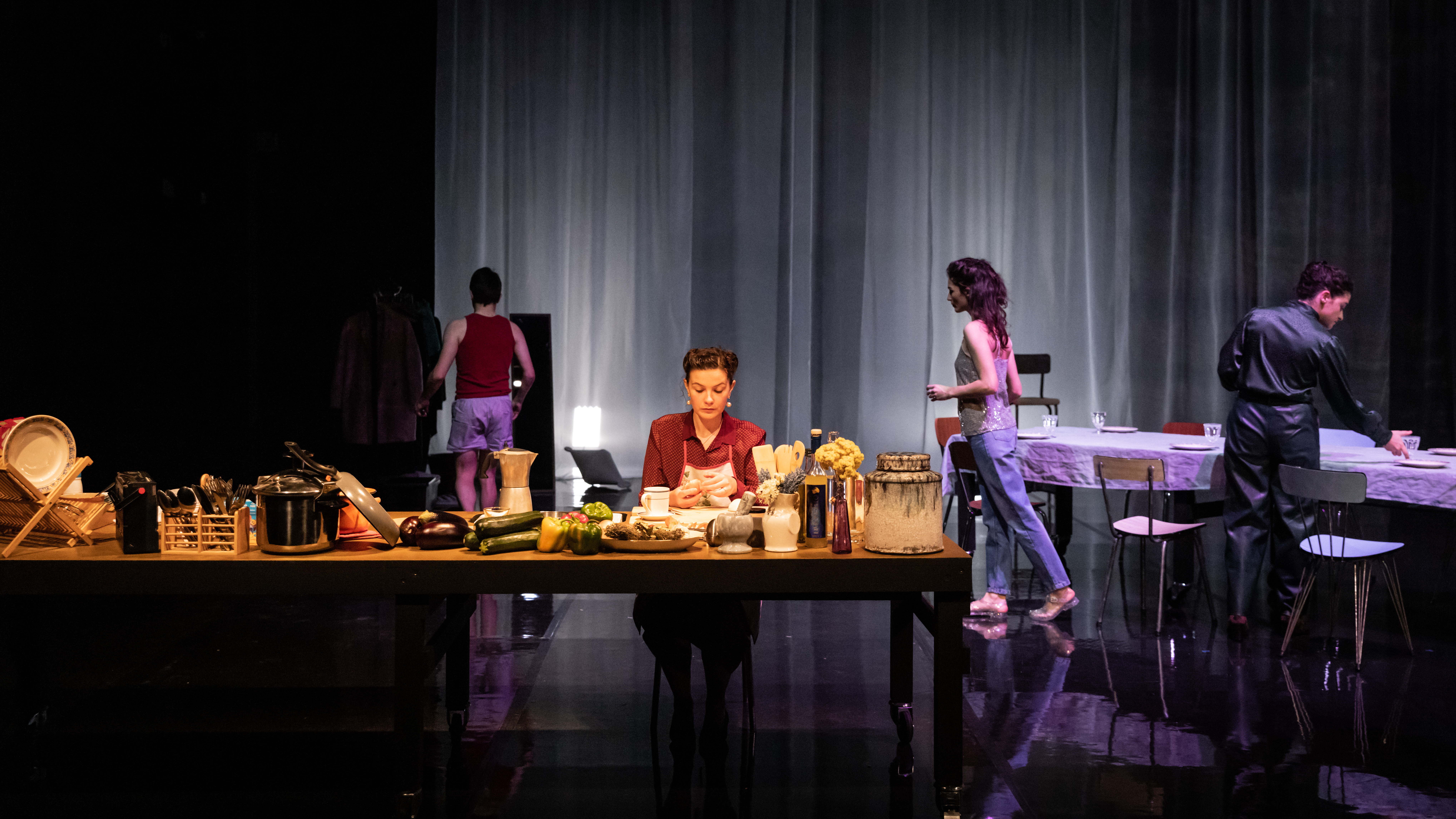 Les Iles singulières sont une adaptation de Le sel, de Jean-Baptiste Del Amo, un roman à quatre voix qui retrace l’histoire d’une famille de Sétois d’origine italienne. Jonathan Mallard, le metteur en scène, l’a transformé en une partition pour neuf personnages. Pour ce faire, il a « axé l’adaptation sur la confrontation entre le vécu de la fratrie et le regard de leurs compagnes et compagnons ». Cinq comédiens, neuf personnages. De part et d’autre de la scène, un portant à vêtements ; la scène ressemble souvent à un espace de déshabillages et habillages. Le dispositif est courant, on l’a vu par exemple dans une récente performance à Beaubourg du collectif Forced Entertainement, 12 AM : Awake and Looking Down. Le problème tout bête qui se pose ici au spectateur, c’est : qui est qui ? La valse des prénoms renforce la sensation de fouillis : qui est cet Armand ? ah oui, le père ! pourquoi les enfants ne l’appellent-ils pas papa ? parce qu’ils veulent le tenir à distance ? eh oui, mais on n’est pas dans un livre, qui permet de revenir en arrière.