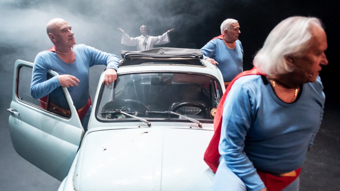 Ici, les retraités sont statufiés en superman, posés rigidement sur le plateau, sommés de témoigner devant un public suisse (puisqu’il s’agissait d’une production du Théâtre Vidy-Lausanne, créée dans ce même théâtre) de la réussite de leur intégration. Mis en scène par un metteur en scène de la seconde génération…