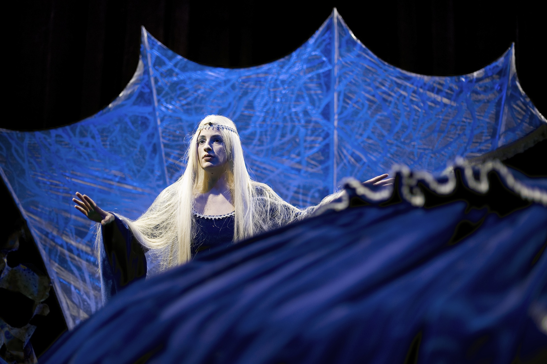Une montagne drapée de tissus, rappelant étrangement la partie inférieure d’une énorme robe de princesse trône sur la scène du Théâtre de l’Est Parisien. Derrière, un pan lumineux représente une couronne démesurée. Une lumière bleuté installe une ambiance de mystère. Nous voici déjà plongés dans l’univers des Petites Empêchées, conte féérique doté de mystères et de personnages aussi disparates que fascinants.