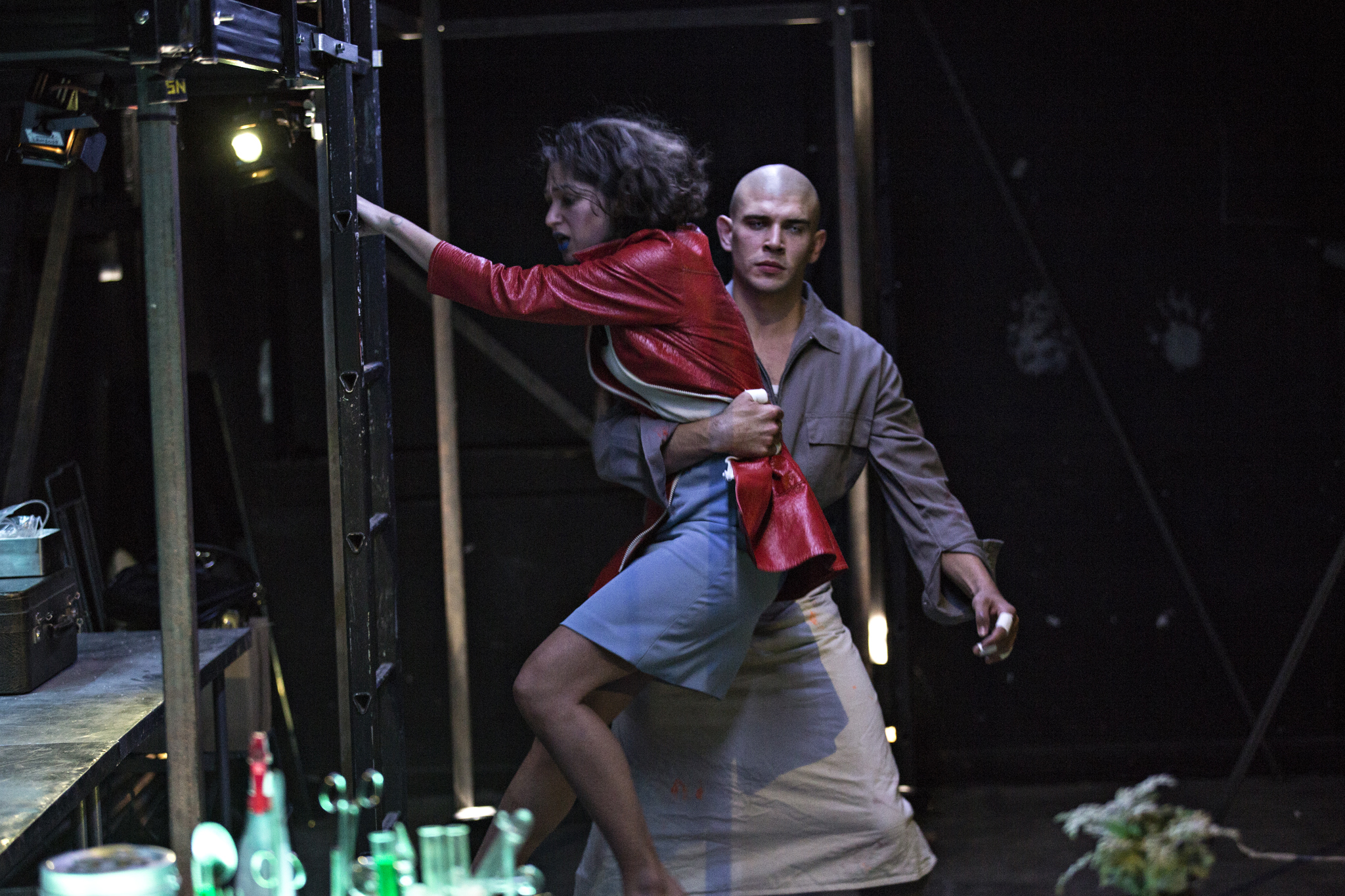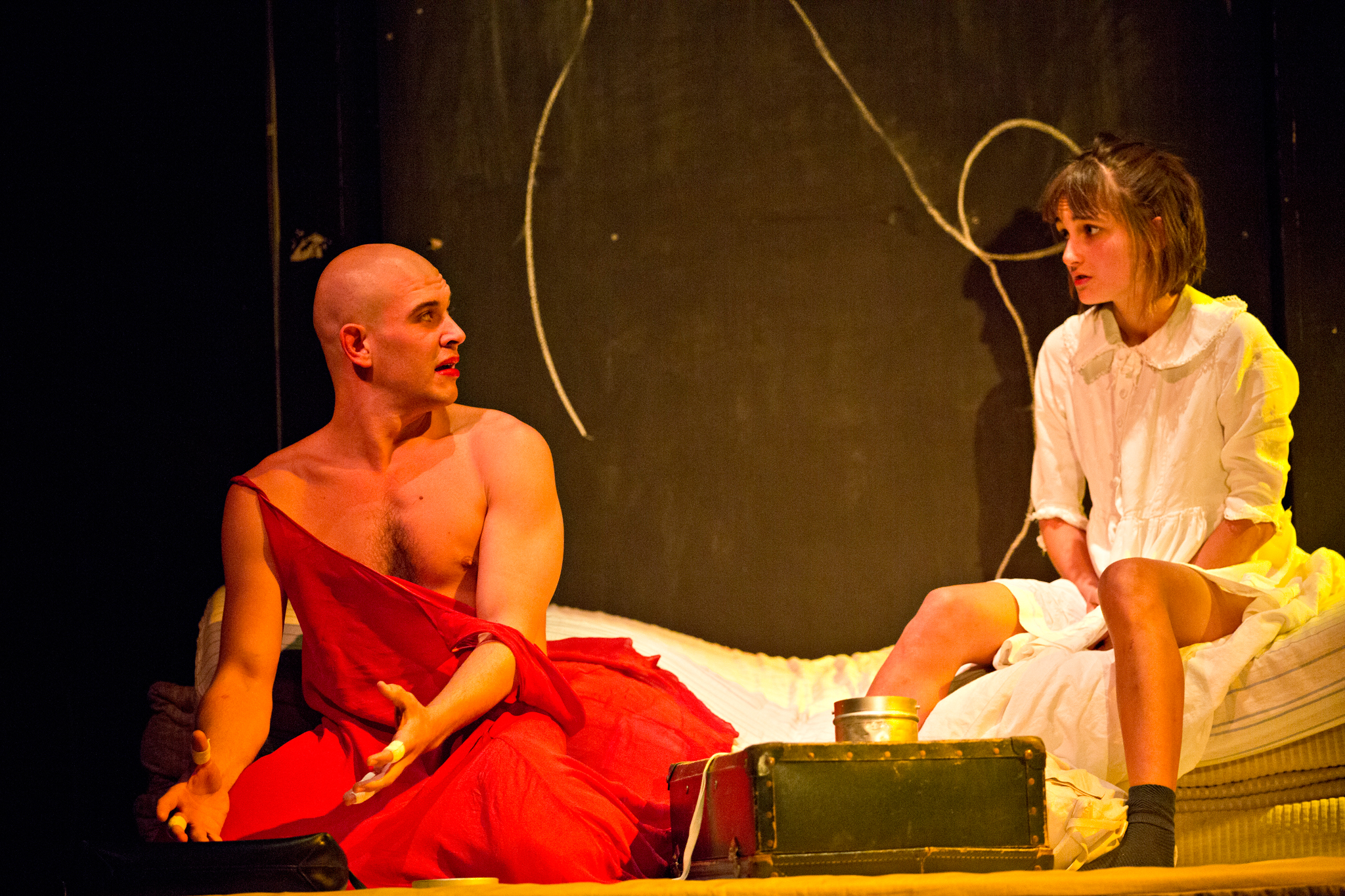 Projet personnel de sortie d’école créé en 2016 au TNS, et alors remarqué par le dispositif « cluster », Les Terrains vagues de Pauline Haudepin se présente comme une revisitation « moderne » du conte de Grimm, Raiponce. La mention en est superflue, tant la fable se déploie vers des imaginaires divers : certes, Pauline Haudepin conserve le nom de son personnage, Raiponce, et lui adjoint un prince qui perdra la vue, comme dans l’histoire originelle. Ici, il s’appelle Lazslo, nom mystérieux et beau s’il en est. Ici, les parents de Raiponce s’appellent Sandman et Colchique : une fleur de l’été, emportée par le vent, pour l’une, et, pour l’autre, un marchand de sable, comme le rappelle une autre chanson, fredonnée plusieurs fois dans la pièce (« Mr. Sandman, bring me a dream/ Make him the cutest that I’ve ever seen ») – à moins que ce ne soit l’« homme au sable » des contes d’Hoffmann. Point non plus de haute tour, ici, mais un amoncellement de galetas. Point de longs cheveux et de soie. Point, sans doute, de mariage final, assorti d’un compte plus ou moins précis d’enfants. « Les Terrains vagues » : au parcours codifié du conte succède une instabilité inquiétante.