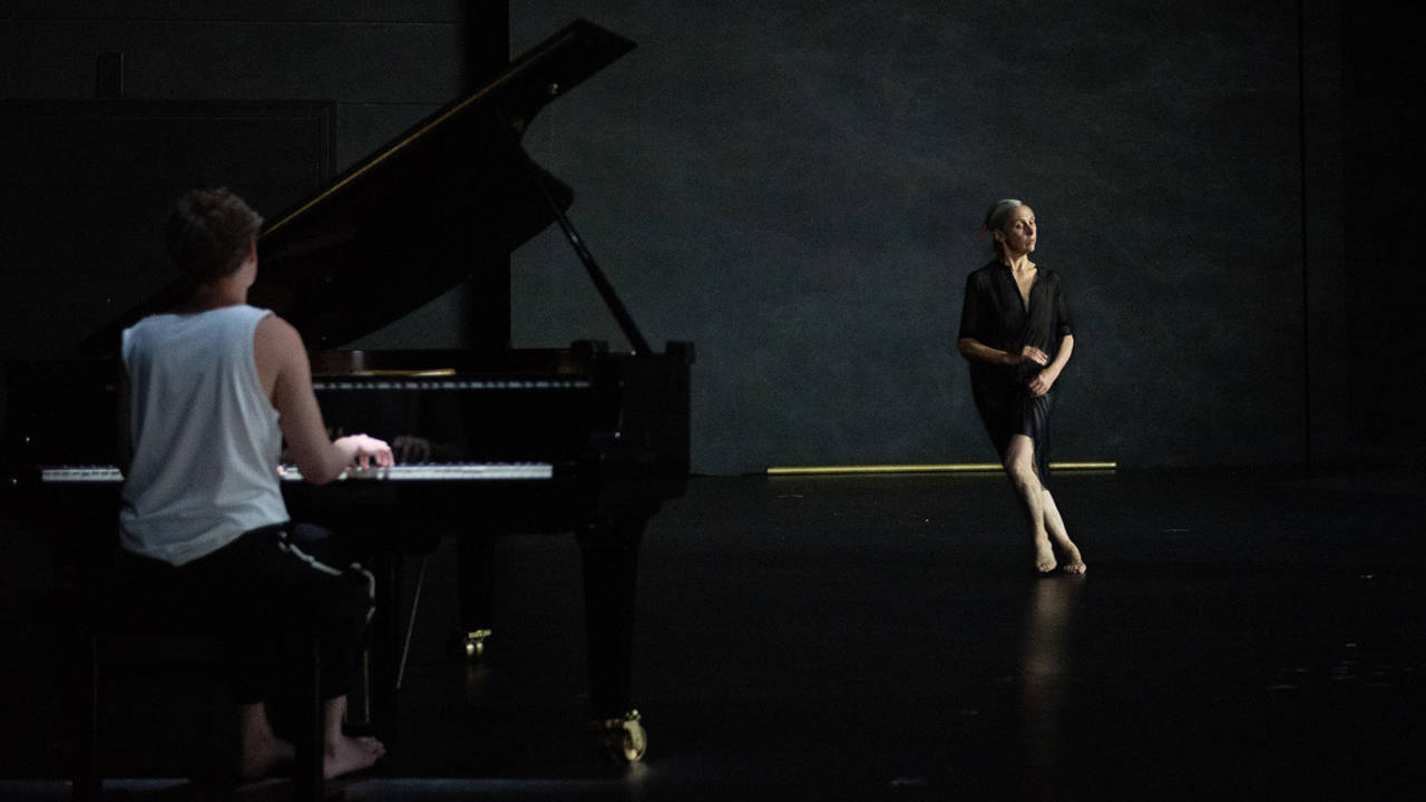 Et le noir complet se fait. Silence. Nous attendons. Et arrivent Anne Teresa De Keersmaeker et Pavel Kolesnikov, la danseuse et le pianiste. Elle portant une robe noire, ne gardant rien de l’opacité que laisserait imaginer cette couleur, lui en débardeur et bermuda, qui ont tous les deux quelque chose de géant, débardeur et bermuda, qui donnent une impression de « jeu » déjà. Silence encore. Et Les Variations Goldberg, BWV 988 démarrent. Bach offert comme à la fois par suspension et évidence. Comme si Pavel Kolesnikov nous prenait entre ses mains et nous apportait vers cette scène noire où Anne Teresa De Keersmaeker débute une longue discussion avec Bach, avec Les Variations Goldberg, BWV 988. Très innocemment, sépare d’abord la musique, la danse. Puis l’évidence revient vite, ces mouvements, la lenteur, la vitesse, la disparition, ce corps et ces notes sont ensemble sur scène, ils se connaissent bien et échangent entre eux.
