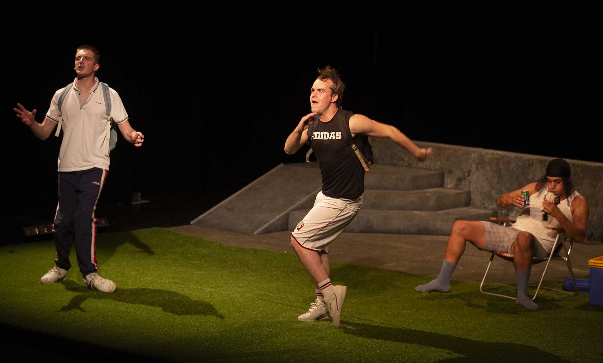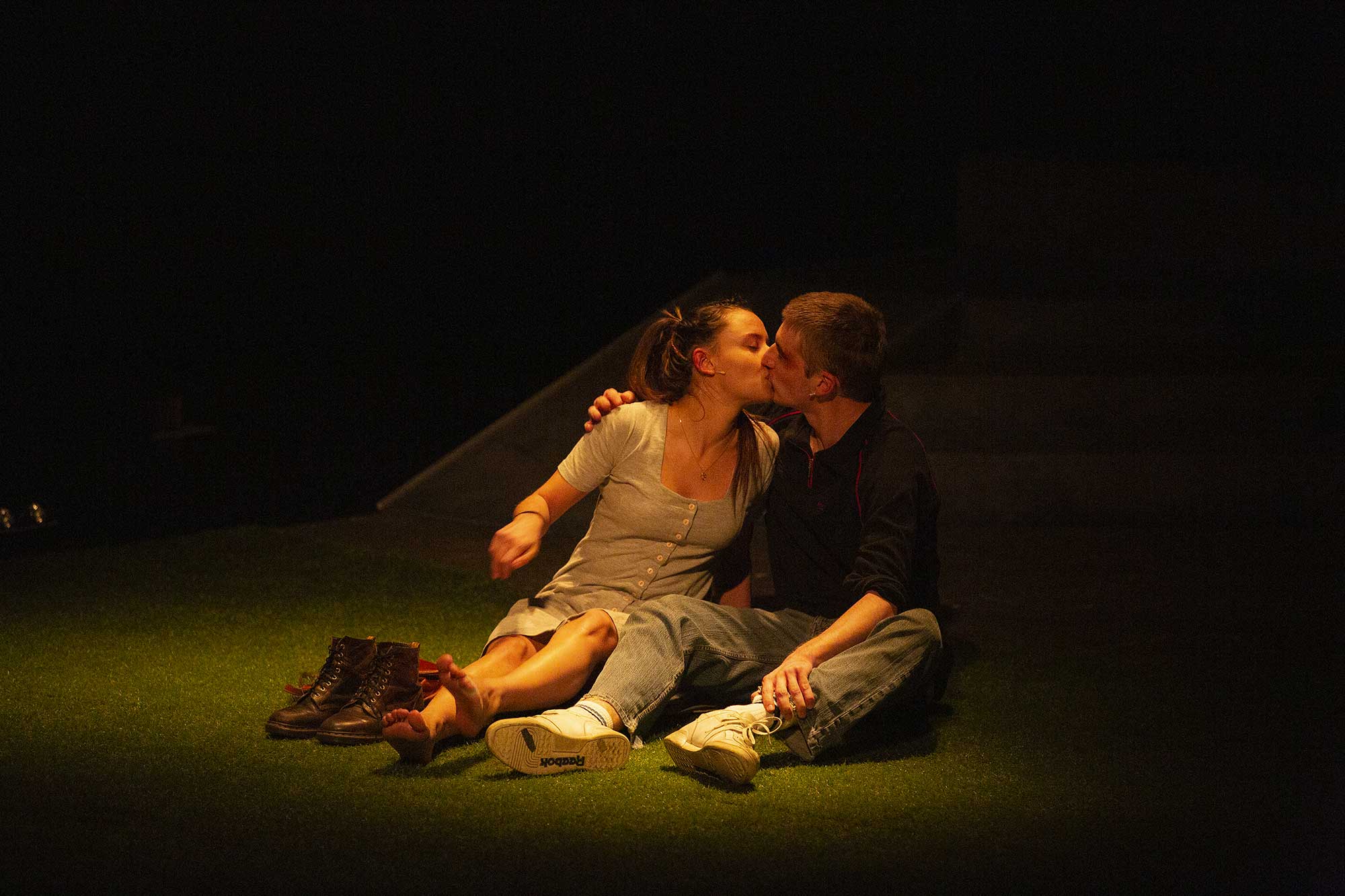 Apres une scène d’exposition sur une sorte de terrain vague ouvert et herbeux avec l’ensemble des protagonistes, l’intrigue se resserre autour de deux familles celles d’Anthony et de Hacine, l’espace du plateau se remplit de murs, de parpaings comme pour figurer l’enfermement progressif de ces jeunes qui prendront la suite de leurs aînés, seront manutentionnaires chez Darty ou caissiers à Franprix, et leurs enfants après eux. On est dans l’Assommoir avec la lente plongée du père dans l’alcool et la dépression de la mère jouée par Lauriane Mitchell. Il faut l’écouter dans un rare moment de répit, à la piscine, comme étrangère à son propre corps avec les rayons de soleil éclairant son visage happé par le vide. Dans l’autre famille, d’origine algérienne le père est devenu mutique, ruminant sa défaite depuis la fermeture de l’usine. Même l’amour est sans espoir. Dans la salle bourrée à craquer, des jeunes en majorité qui rient par moments, de gène, d’émotion ? Car franchement, il n’y a pas de quoi rire.