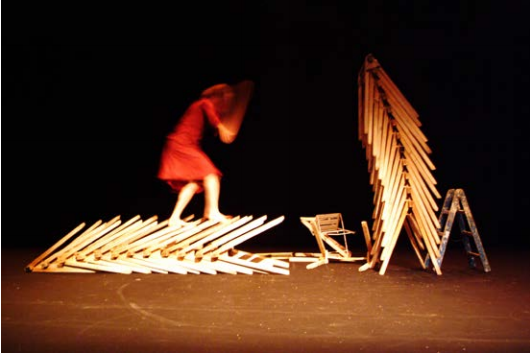 Le décor fait de bois (des tréteaux) est manipulé, jeté, entassé puis trié, rangé pour à nouveau être manipulé et jeté… Ces tréteaux deviennent roues, rouages, armées, millepattes. Des objets métalliques autour de la scène ressemblent à des insectes géants. Ce décor est splendide, inventif. Il donne envie de réécrire les objets.