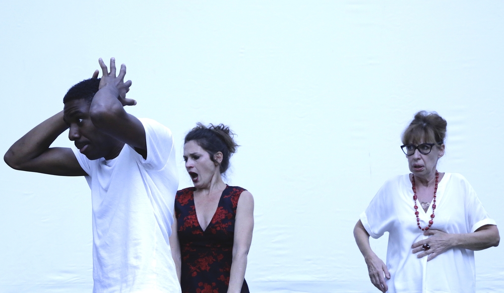 Surtout Pierre Notte, de son écriture si pointue, de sa plume sergent-major trempée dans l’acide, dresse le portrait de trois drôles de zèbres, personnages en proie à leurs propres contradictions, quelque peu déboussolés devant une situation qui leur échappe, des convictions qui se font la malle, et dont ils se dépatouillent comme ils peuvent. Et ils sont formidables ces trois-là qui jouent du premier degré comme du second, et même du troisième, font d’une tragédie possible un numéro de clown et vice et versa. Muriel Gaudin (l’accueillante) et Clyde Yeguette (le réfugié) c’est Foottit et Chocolat chez les fachos… avec Silvie Laguna (la modératrice), royale et telle qu’en elle-même dans son propre rôle, en Madame Loyal pousse-au-crime. Pierre Notte signe une mise en scène bien secouée, légère et vive, qui fait fi de la vraisemblance pour mieux en extraire une vérité pas jolie-jolie sous le vernis de la farce. Mise en scène par le vide, ni décor ni accessoire, pour laisser toute la place à nos histrions, ce trio infernal et monstrueux qui visiblement s’en donne à cœur joie à jouer de notre mauvaise conscience, et au texte qui claque, de répliques assassines en réparties fielleuses. Juste, si juste. Jusqu’à embarquer le public dans cette sale affaire, interpellé, complice et témoin malgré lui de cette « farce lamentable » comme le proclame Silvie Laguna. C’est toute la finesse et la force de Pierre Notte de nous asséner nos quatre-vérité, de fouailler et cingler le grotesque de nos préjugés imbéciles sans que nous osions broncher mais pour y trouver malgré tout une étincelle d’humanité. Quand même ! Tout est bien qui finit bien, soit, mais nous sommes au théâtre, ne l’oublions pas tintinnabulent Pierre Notte et notre conscience devant la réalité. Et si une valse peut réparer nos lâchetés alors, pour reprendre Pina Bausch, « dansons, dansons, sinon nous sommes perdus. » On peut encore rêver…