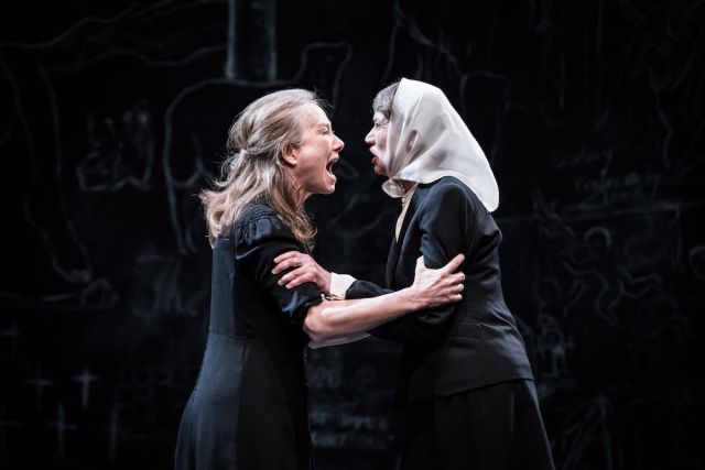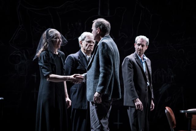La scène est occupée par une estrade surplombée d’un immense tableau d’école noir où se détachent, à la craie blanche, une crucifixion, des cohortes d’apôtres, de saints, une Vierge à l’Enfant, un agneau, comme autant d’ébauches dans un cahier de dessin. La table et les chaises des années 1970 comme le petit sofa, sans oublier une petite desserte éclatante par sa collection de porcelaines blanches, tasses, cafetière, théière, trônent sur l’estrade. C’est une cène de la vie quotidienne brêmoise où l’on partage le schnaps, le café, la tisane. Et le poison.